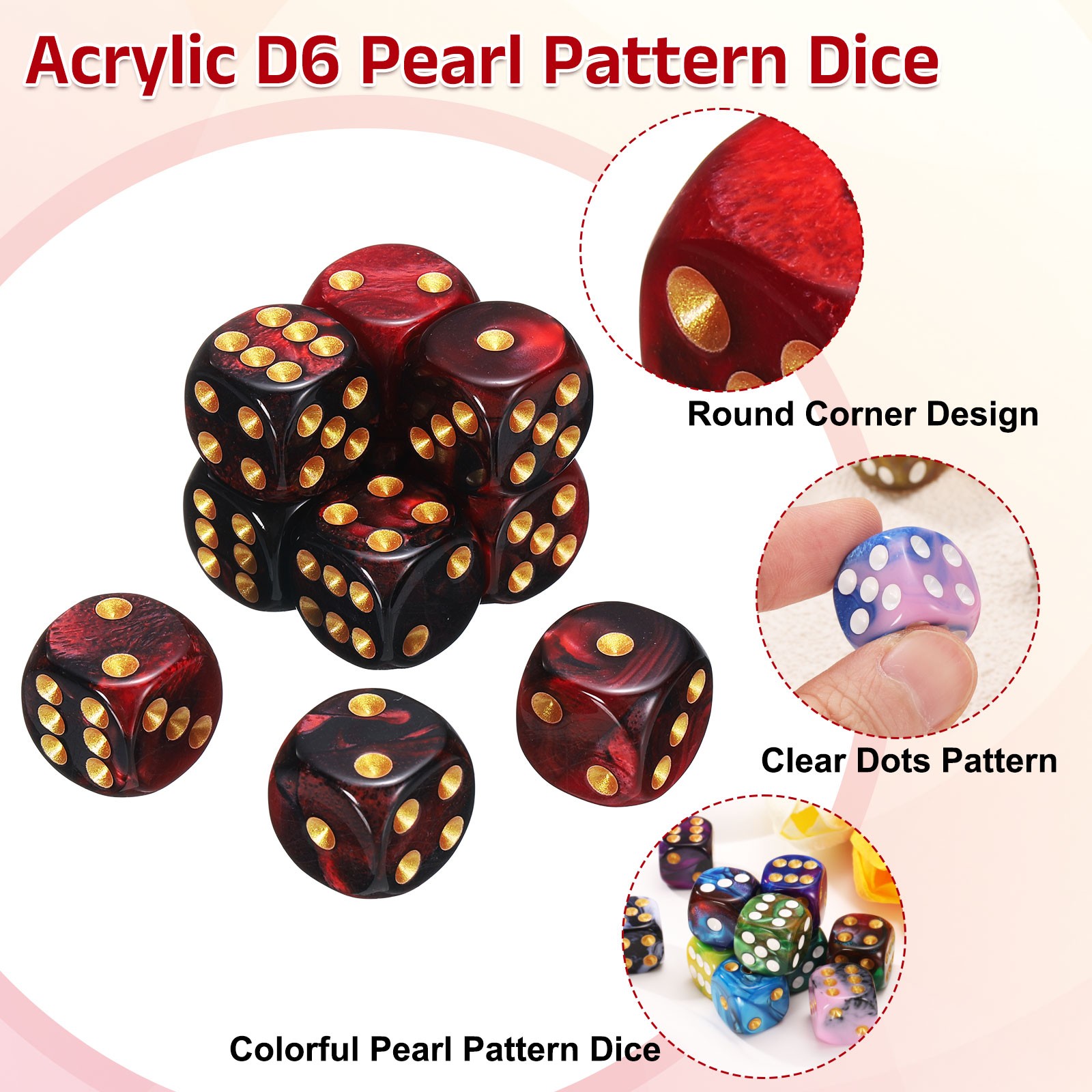 10Pcs 6 Sided Standard Dice, Acrylic D6 Pearl Pattern Dice Red and Black