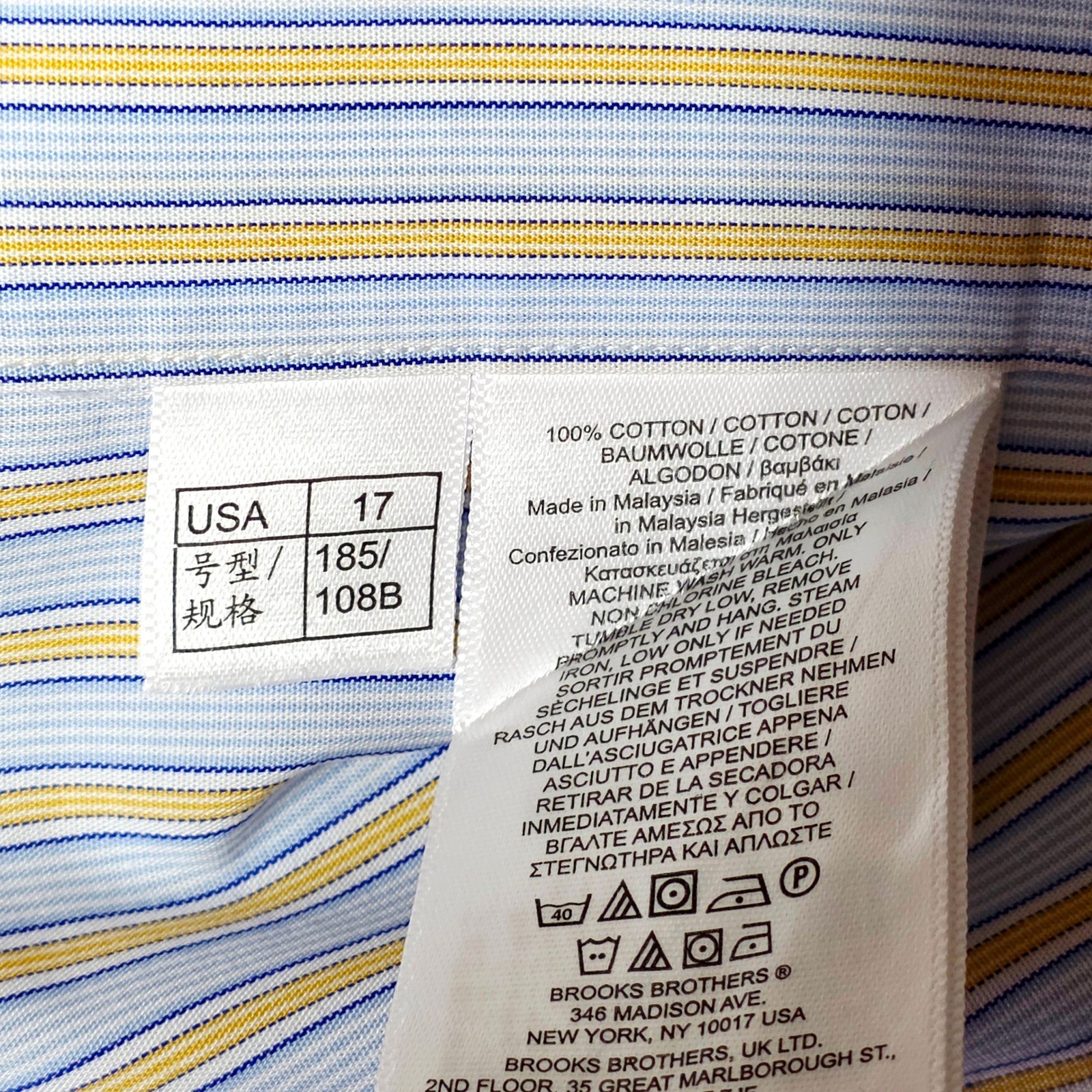 Brooks Brothers Dress Shirt Men 17-33 Blue Yellow Madison Fit Striped Non-Iron