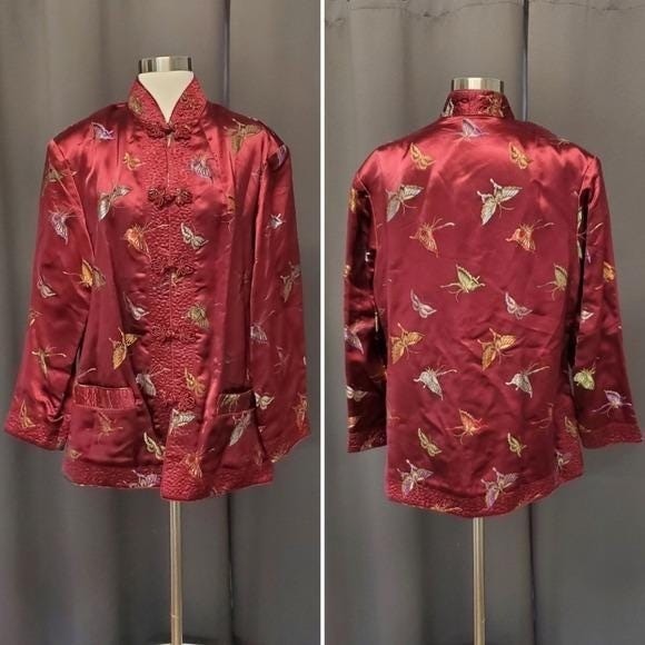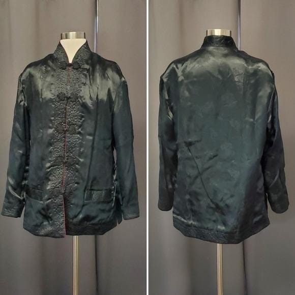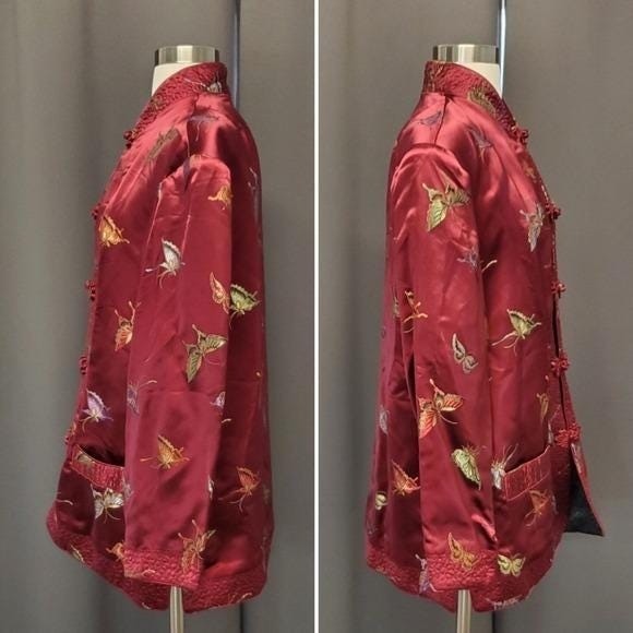 Cheongsam Qipao Reversible Red and Black Oriental Robe Butterfly Pattern Coat Lg