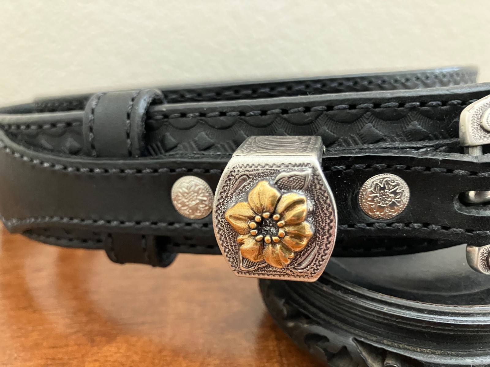 как выглядит Black Basket Weave BULLHIDE BELTS Floral Buckle Quality USA Handcrafted 40" фото