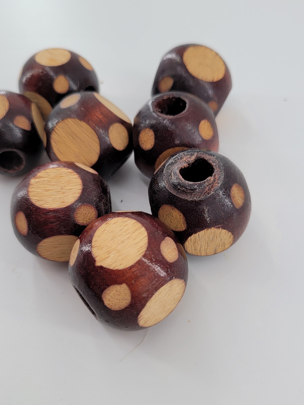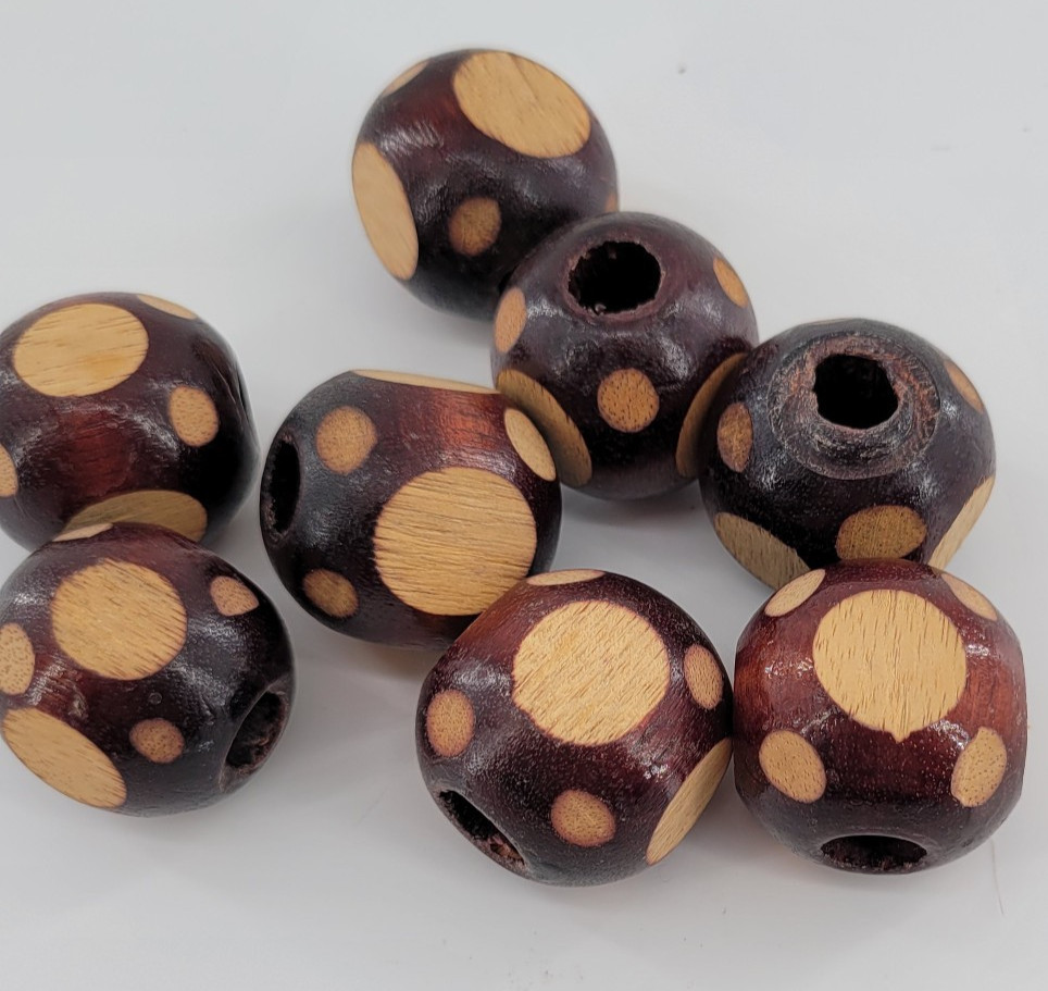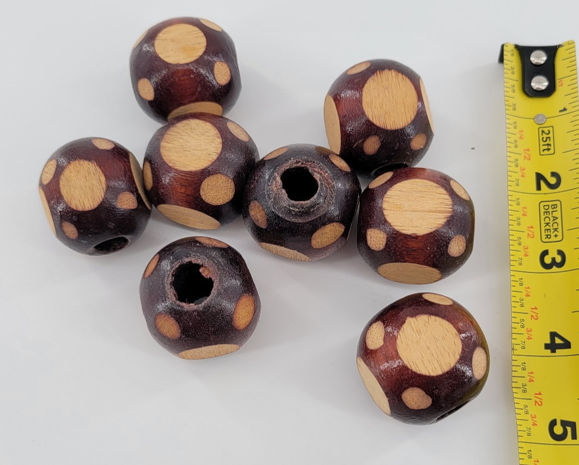 Lot of 8 Dark stained wooden macrame beads with carved natural wood dot pattern