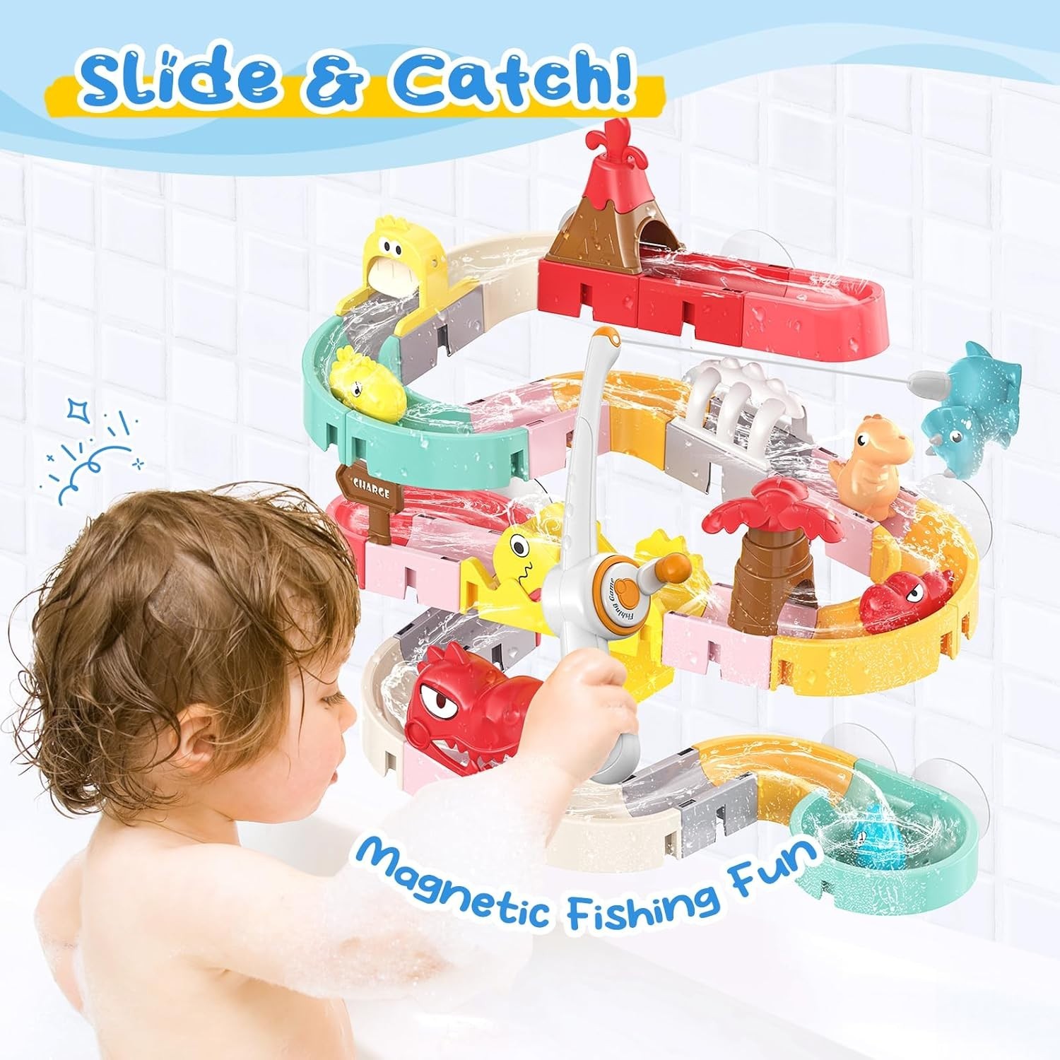Customizable Dinosaur Bath Toy Set with Water Track Suction Cups for Ages 3