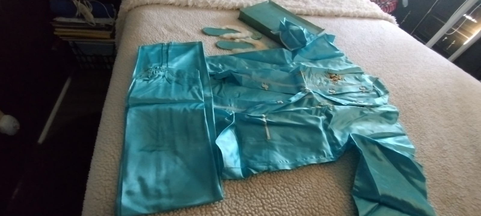 как выглядит VTG 1950s Japanese Embroidered light Blue Silk Pajama Set WOriginal Box And Robe фото