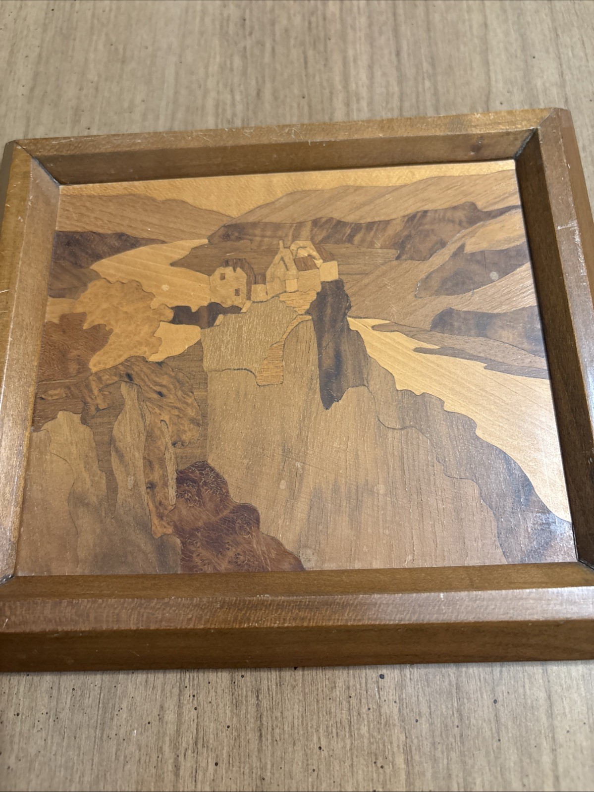 как выглядит Marquetry Wood Mountain Scene With Farmhouse Vintage From Italy Including Frame фото