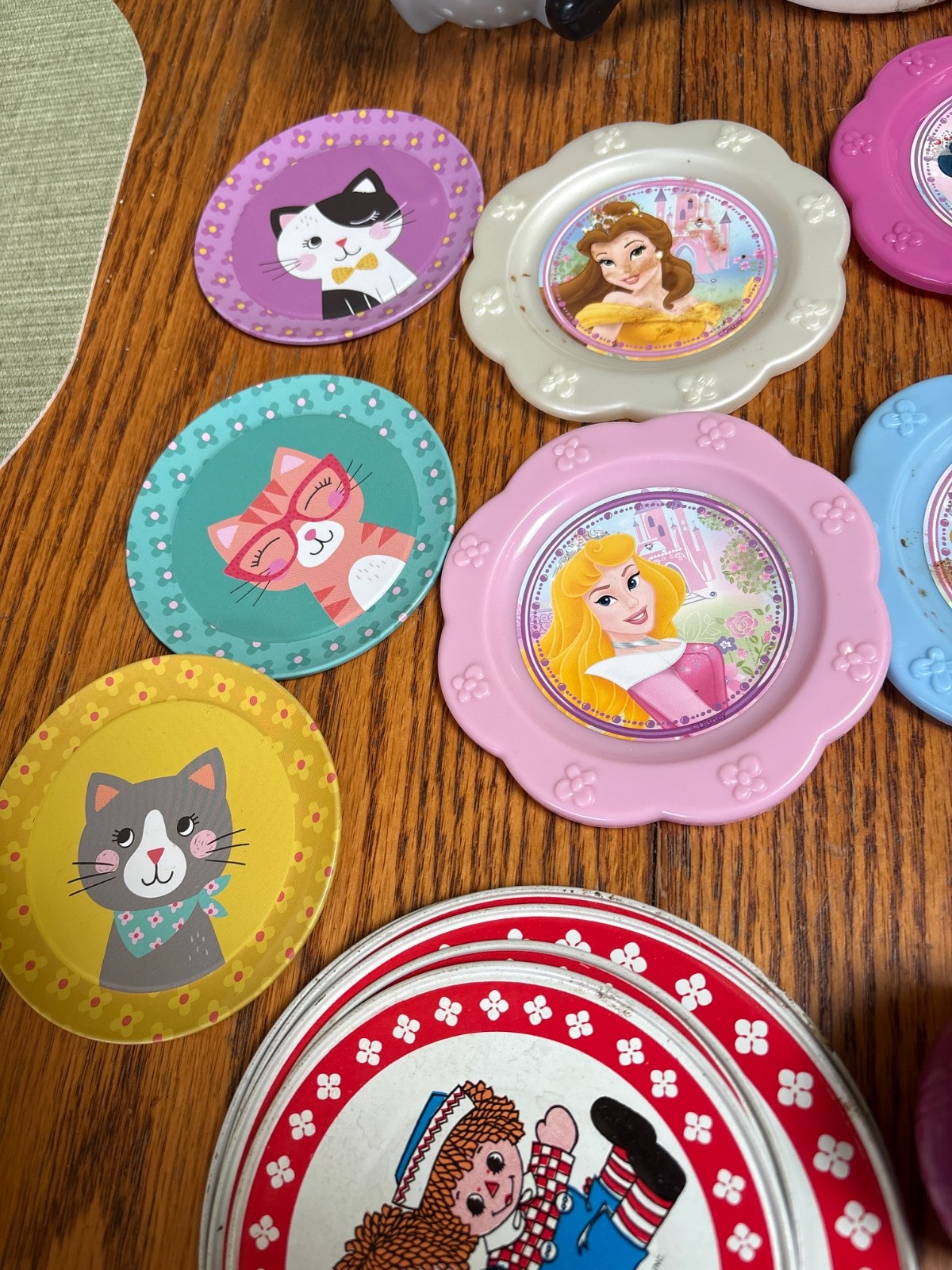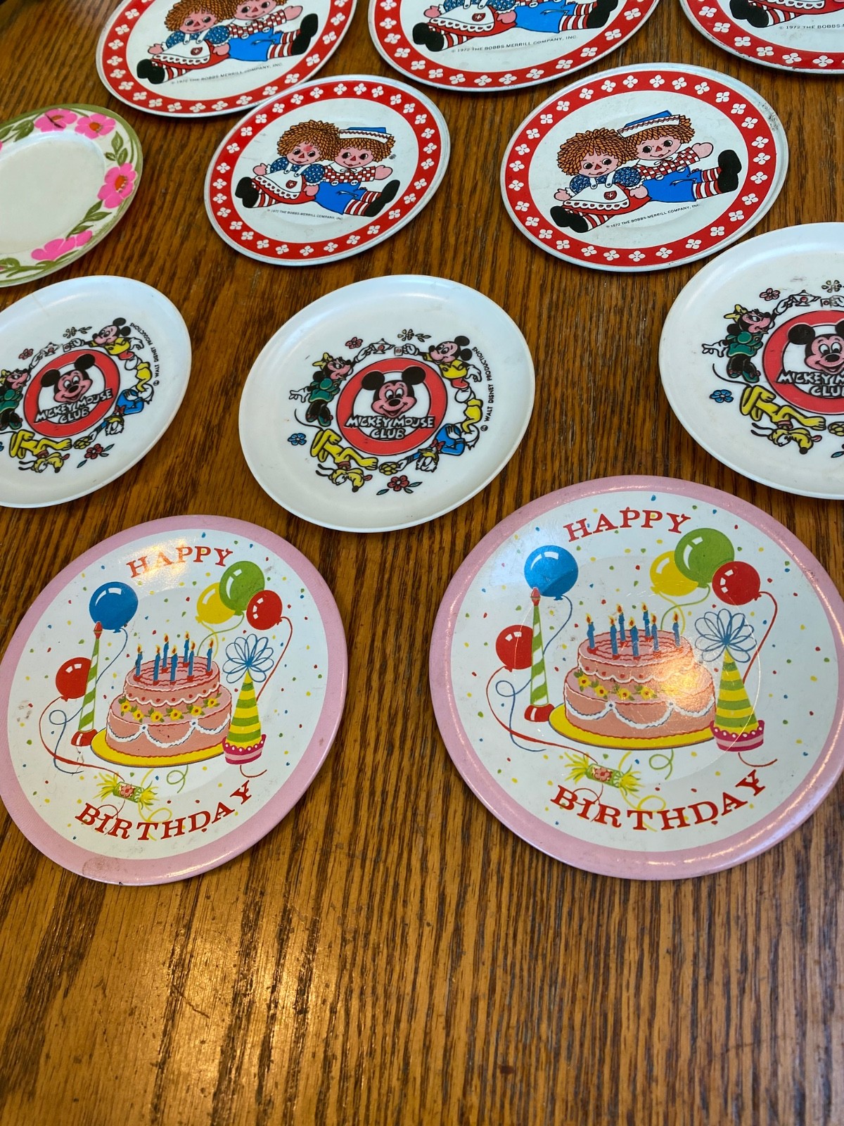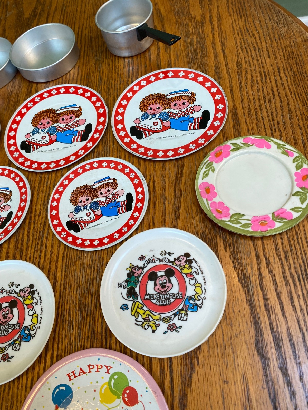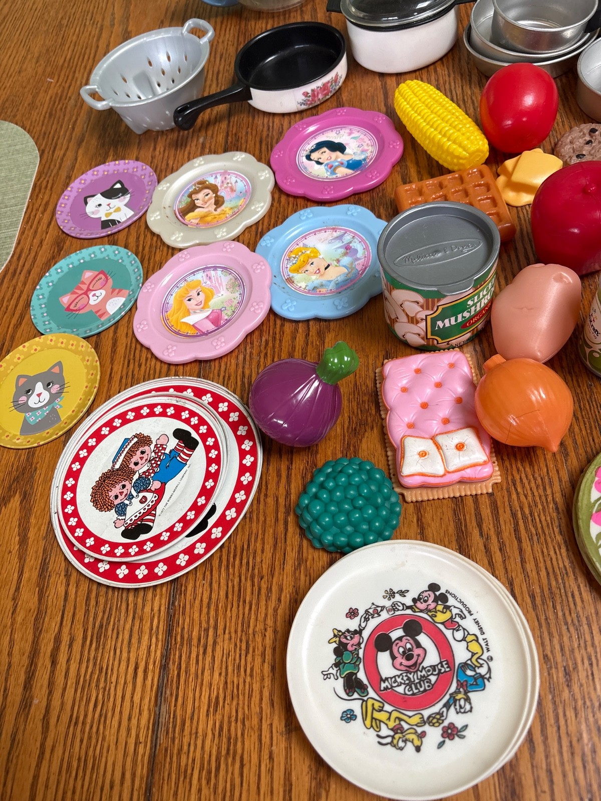 50 Pieces Plastic Tin Play Food Pots Pans Dishes Utensils Fruit Some Vintage