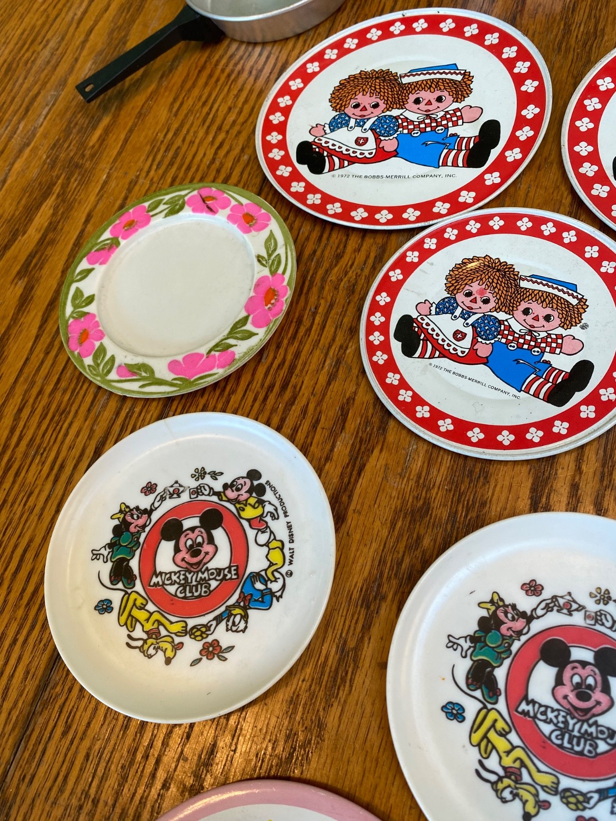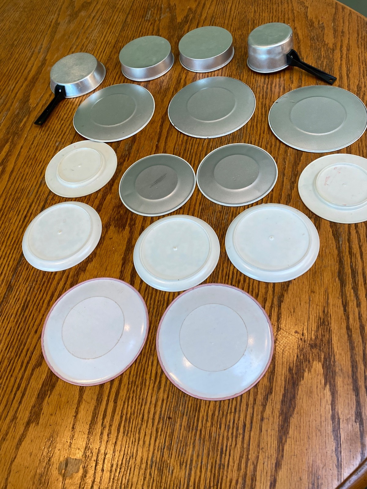 как выглядит 50 Pieces Plastic Tin Play Food Pots Pans Dishes Utensils Fruit Some Vintage фото