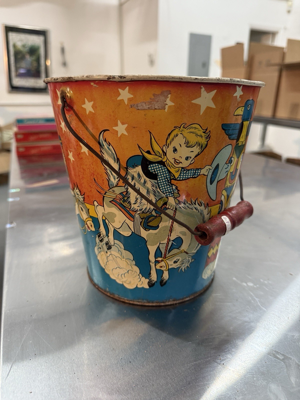 Vintage Tin Litho Sand Pail w Shovel Western Cowboy Kids Toy Set