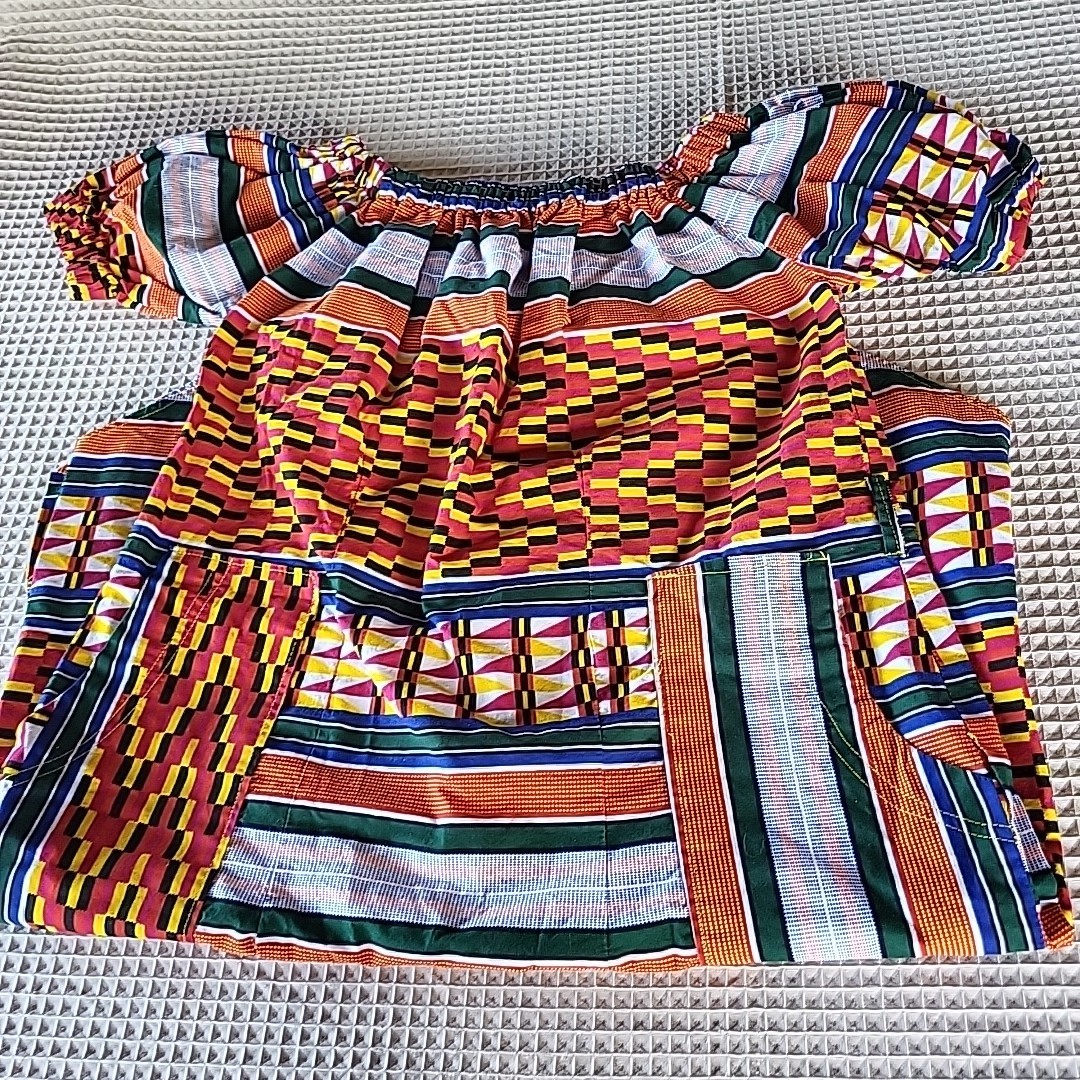 как выглядит Kente Print Dress XL Geometric Striped African Cotton Ghanaian Long Pockets фото