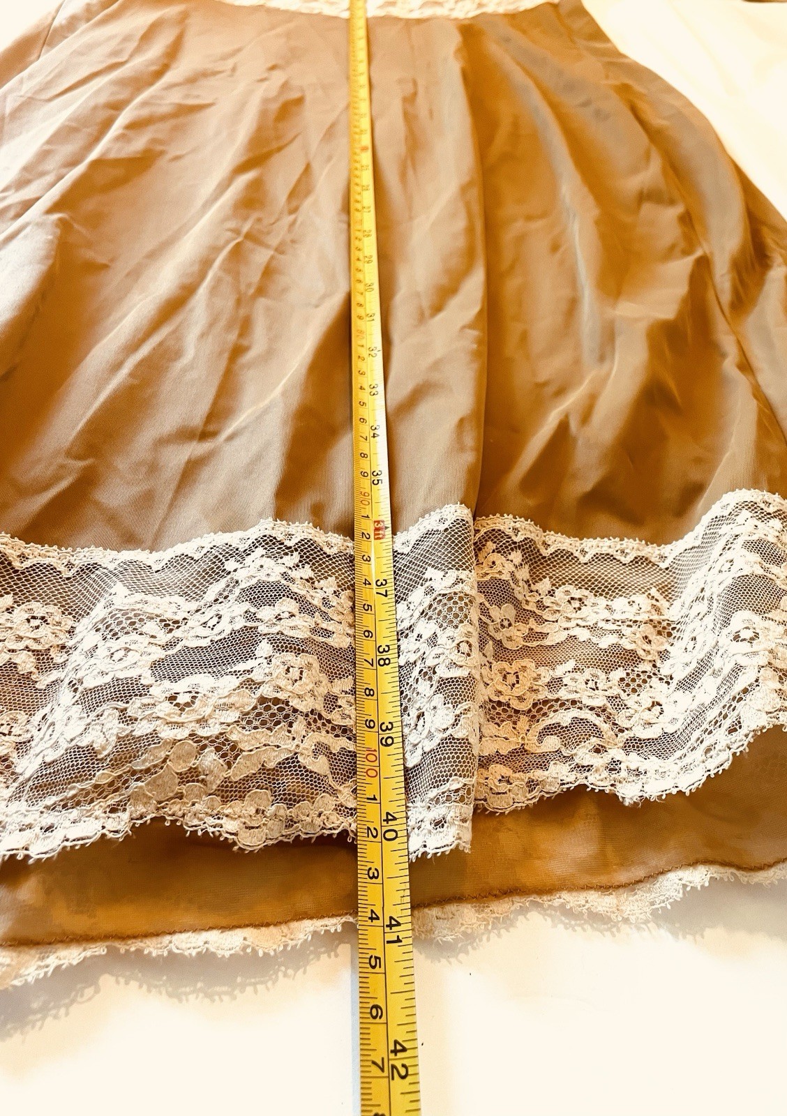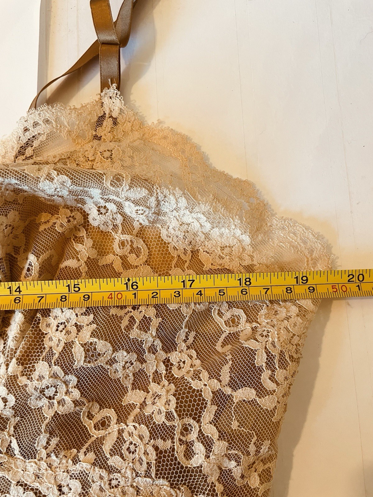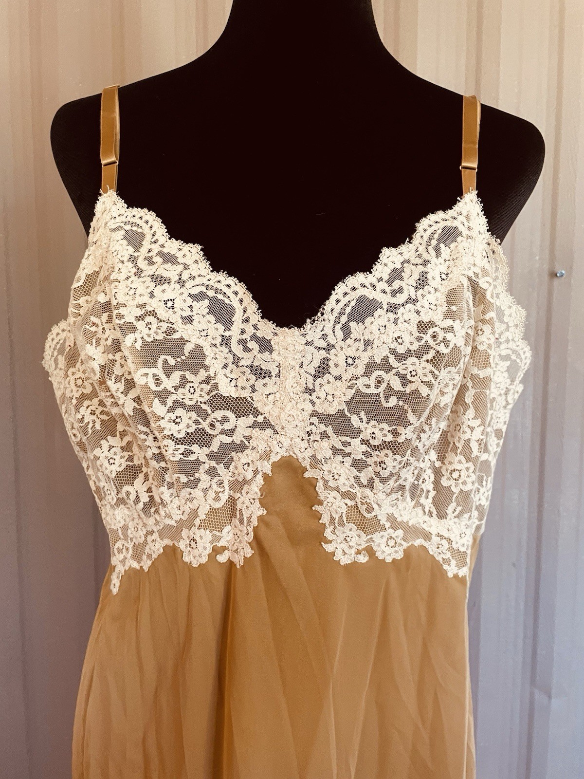 как выглядит VTG Vanity Fair Nude Taupe Slip Dress Lace Nightgown Midi Nylon Feminine sz 40 L фото