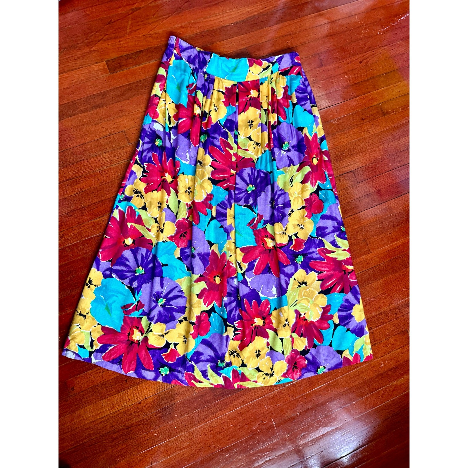 как выглядит Vintage 80s 90s Colorful Yellow Red Purple Floral A Line Midi Stetch Skirt Med L фото