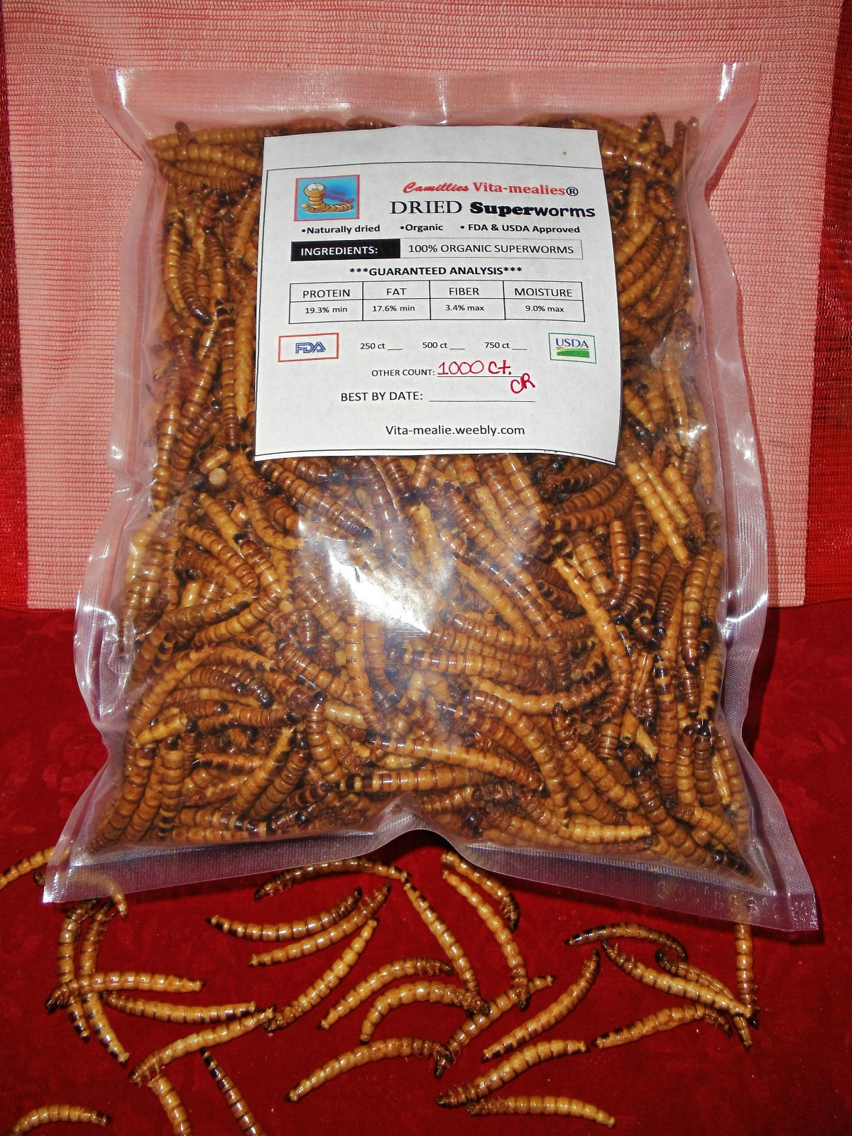 1000 CT Naturally Dried SUPERWORMS raised on USDA Certified Organic Wheat Bran