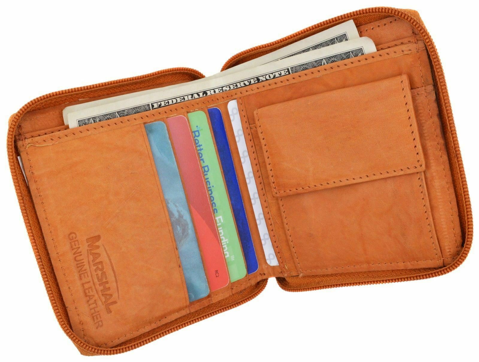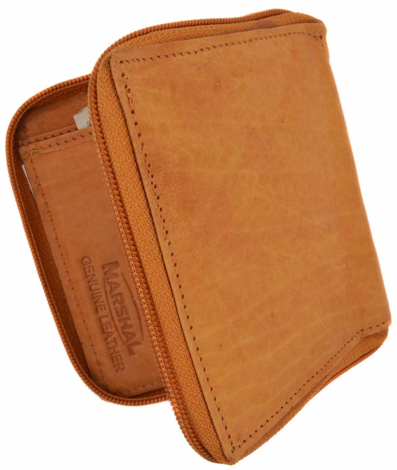 Mens Bifold Zipper Around Leather Wallet Secure Multi Pockets Tan Billfold New