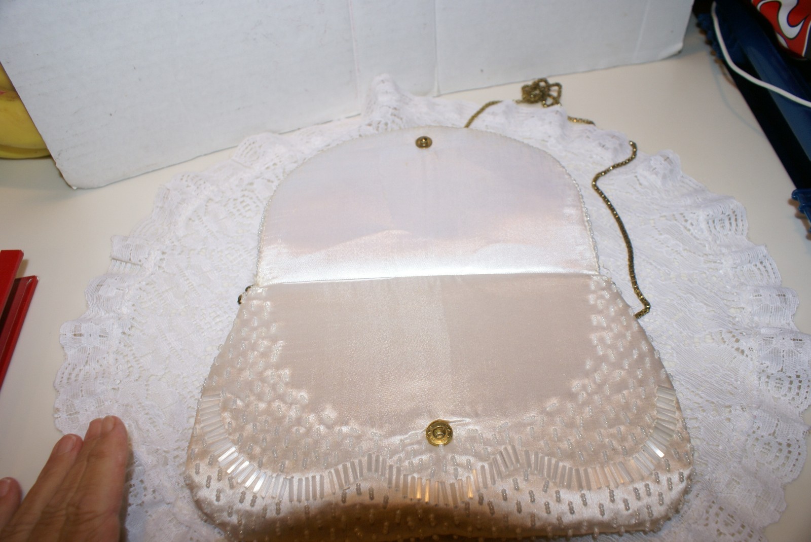 как выглядит La Regale LTD Vintage Handmade Beaded Purse/Clutch WHITE W/CHAIN STRAP 18"DROP фото