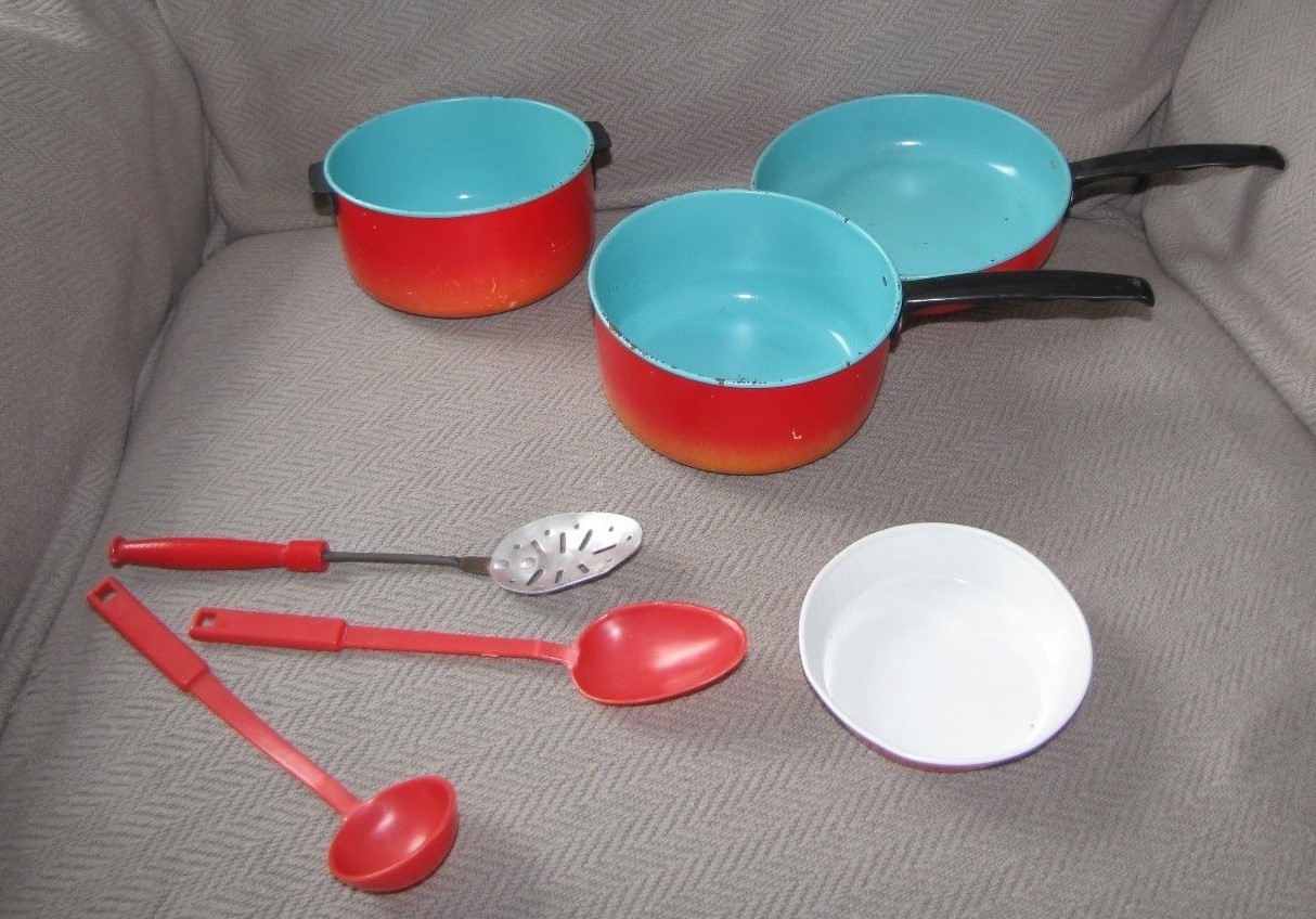 VTG ENAMELWARE ENAMEL WOLVERINE KID CHILD COOKING SET POT PAN FRY FRYING ROOSTER