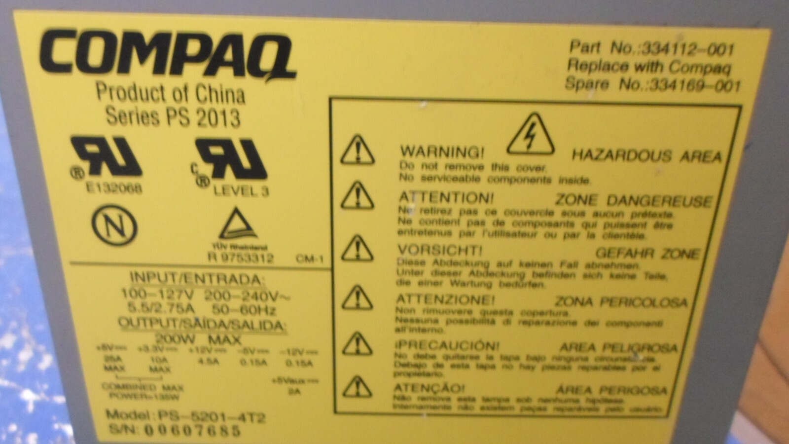 COMPAQ ATX 200W, 334169-001, 334112-001 PS-5201-4T2 Power Supply.