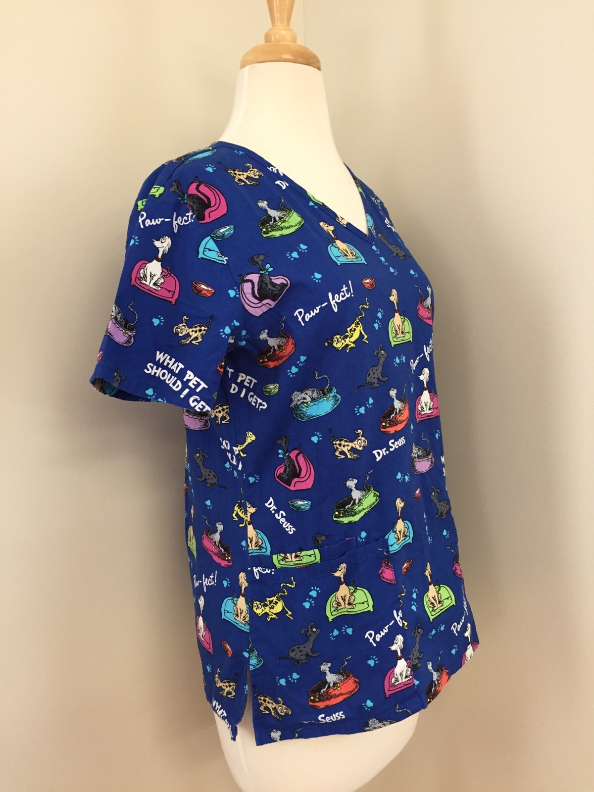 как выглядит Dr. Seuss What Pet Should I Get XS Scrub Top Royal Blue Paw-fect 100 Cotton фото