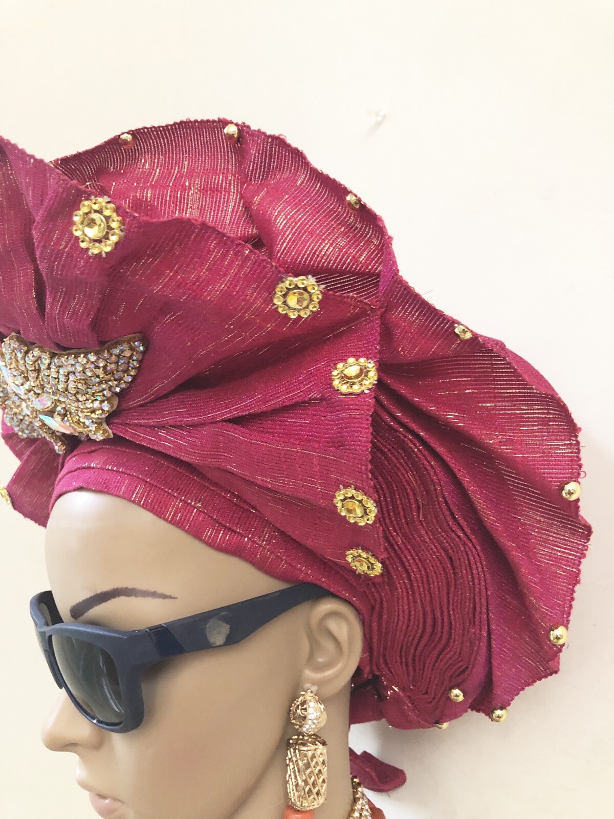 Aso Oke Auto Gele, Fan Gele, Pink Auto Gele, African Head Gears, AutoGele