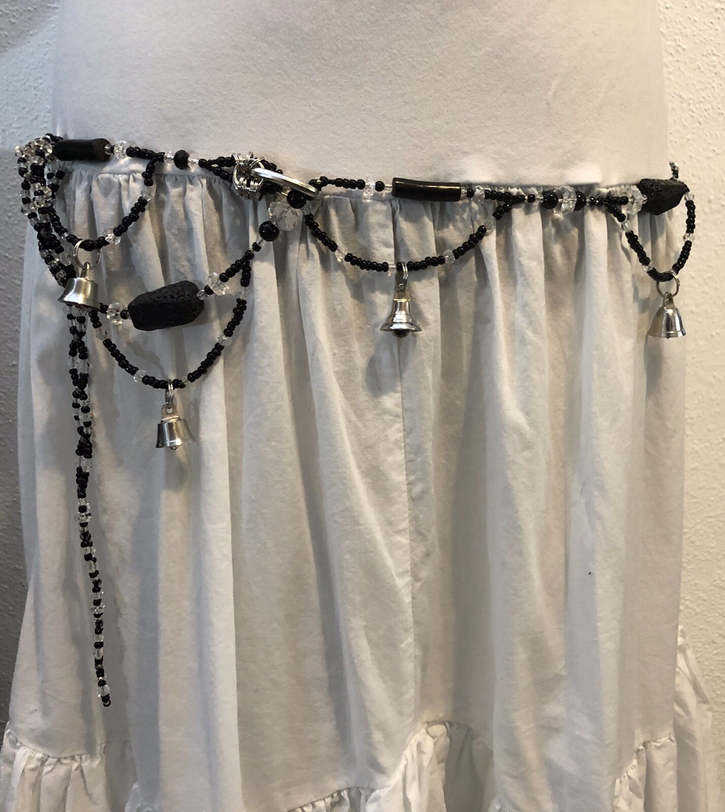 Beaded Belly Dance Belt Black Lava Rock Vintage Cut Crystal Beads Brass Bells