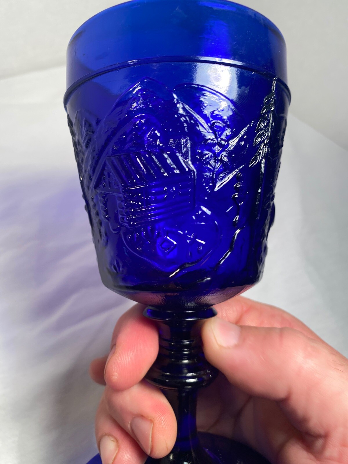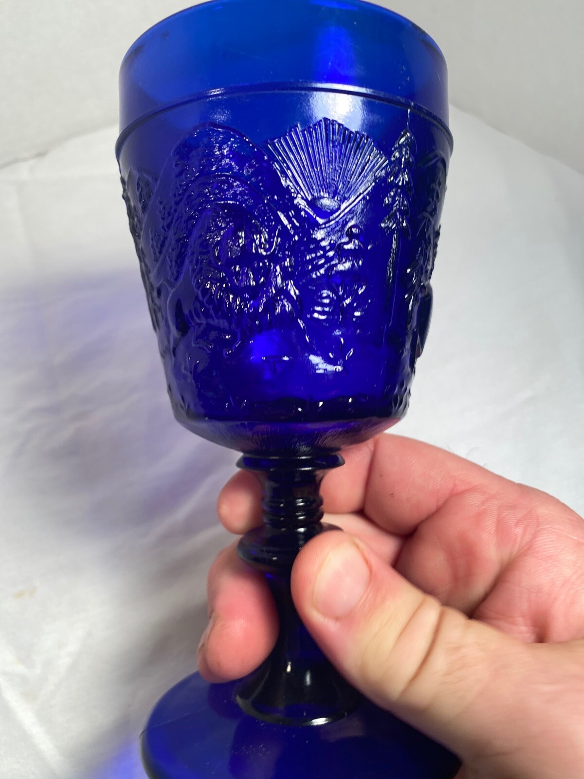 как выглядит Vintage Cobalt Blue Glass Goblet With Cabin Animals On It Nice фото