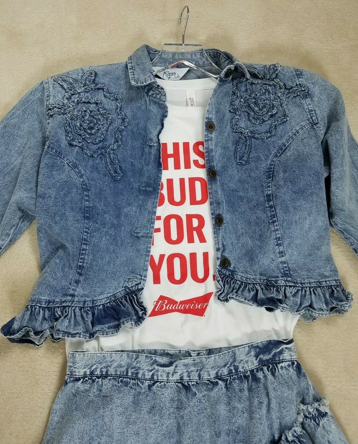 Vntg Denim suit 80s 90s Prairie Skirt set Crop Jacket retro acid wash boho 8 10