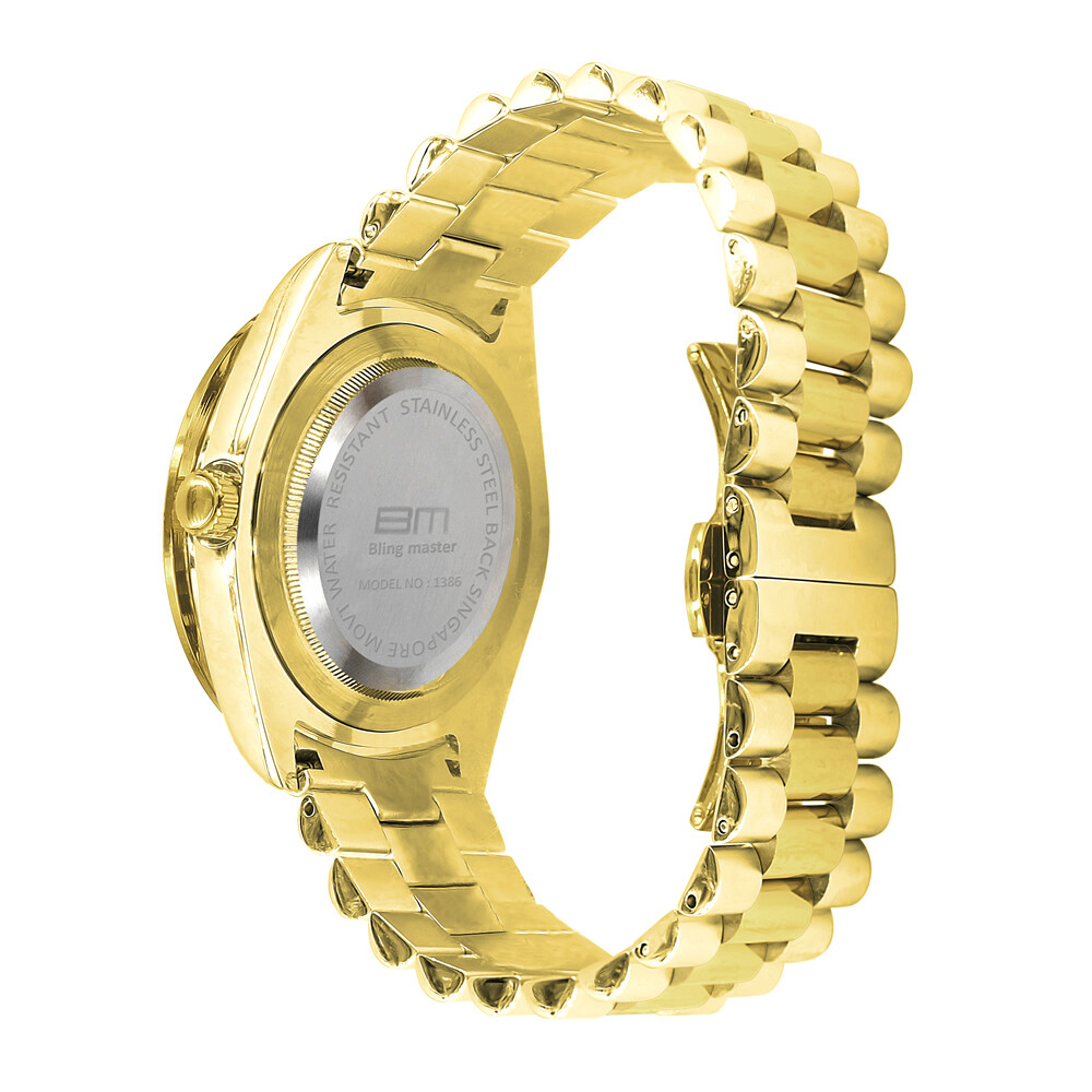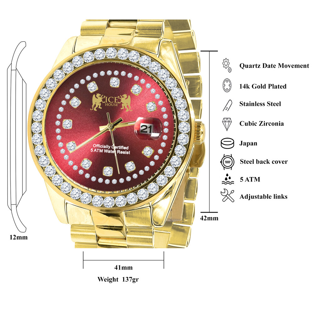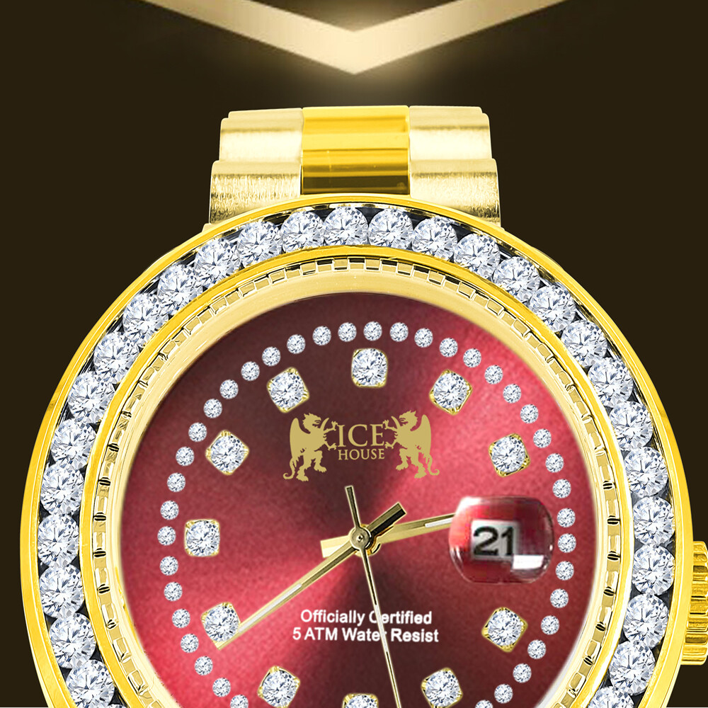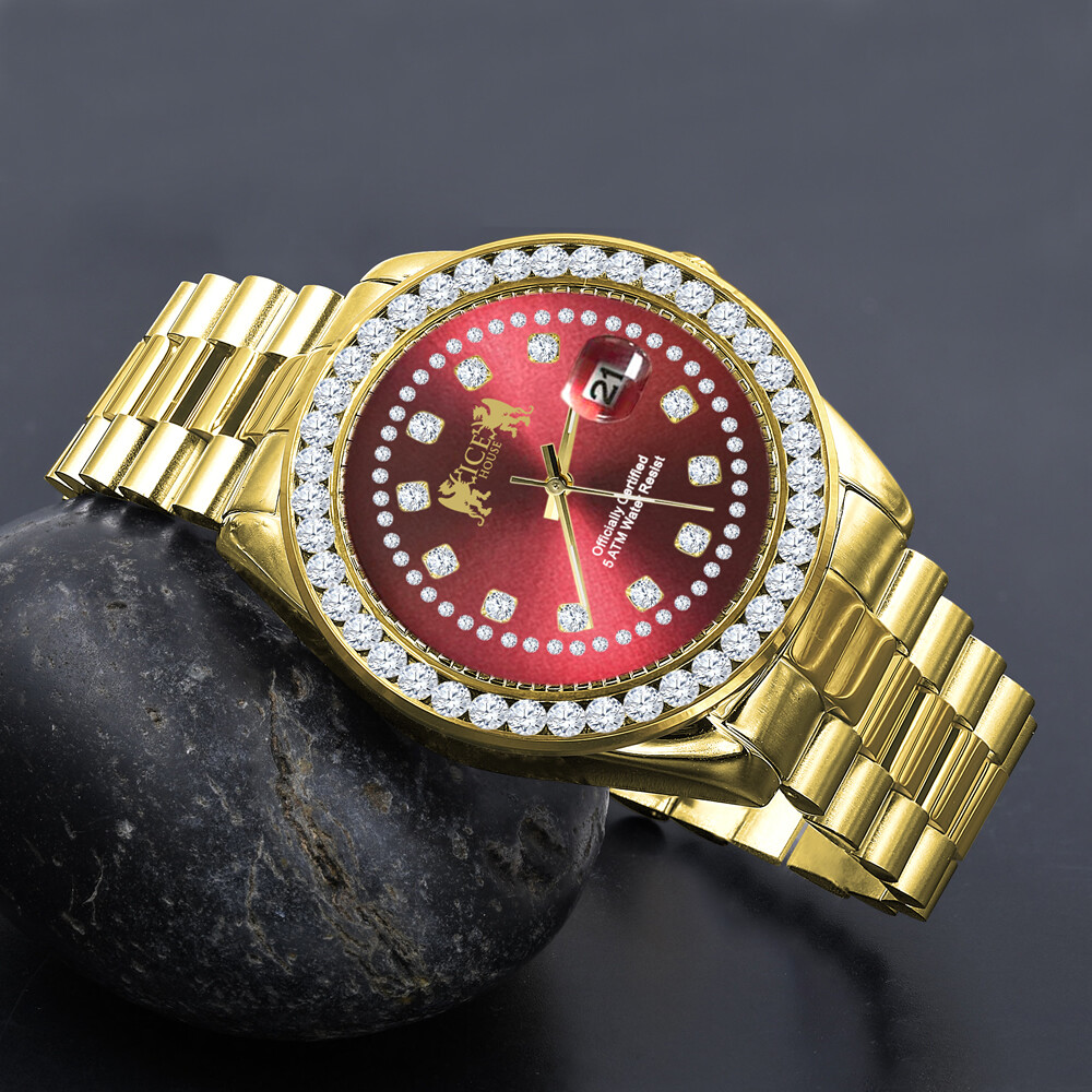 Men's Yellow Gold Finish Red Dial Solid Steel Solitaire Simulated Diamond Watch