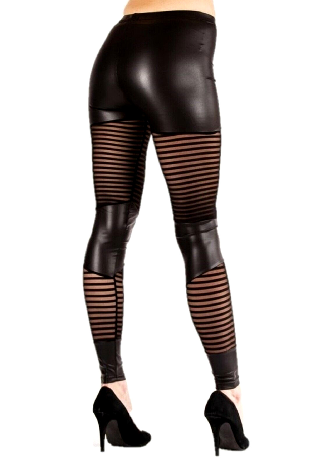 PU DESIGNER LEGGINGS With Mesh Stripe Panels By Flirt London Black UK Size S/M