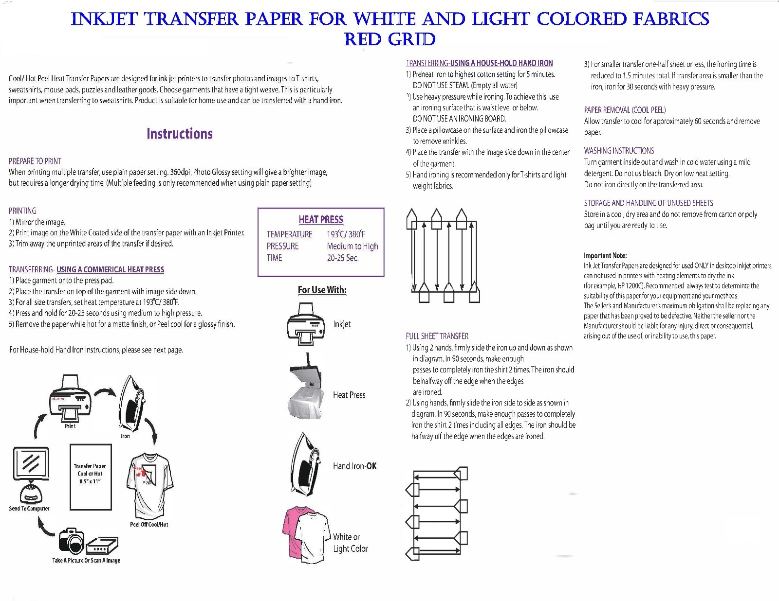 HEAT TRANSFER PAPER RED GRID LIGHT T SHIRT INKJET PAPER IRON ON 100 Sh 8.5X11