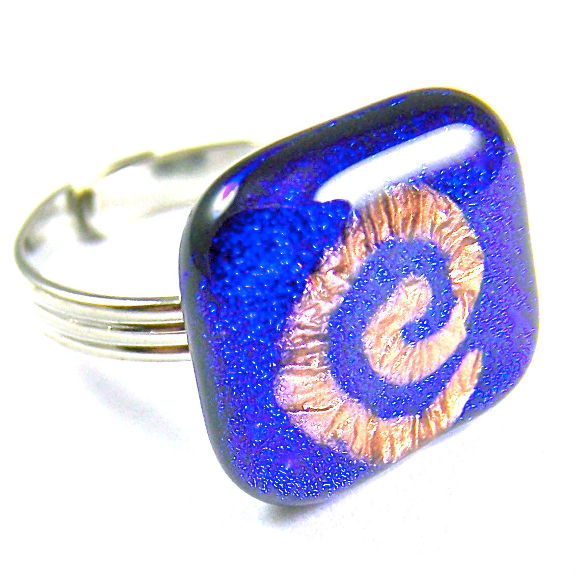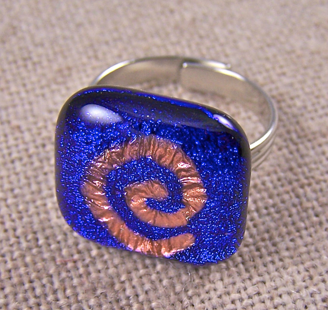 DICHROIC Glass Cocktail Ring Adjustable Silver 3/4 20mm Copper Blue Spiral Coil