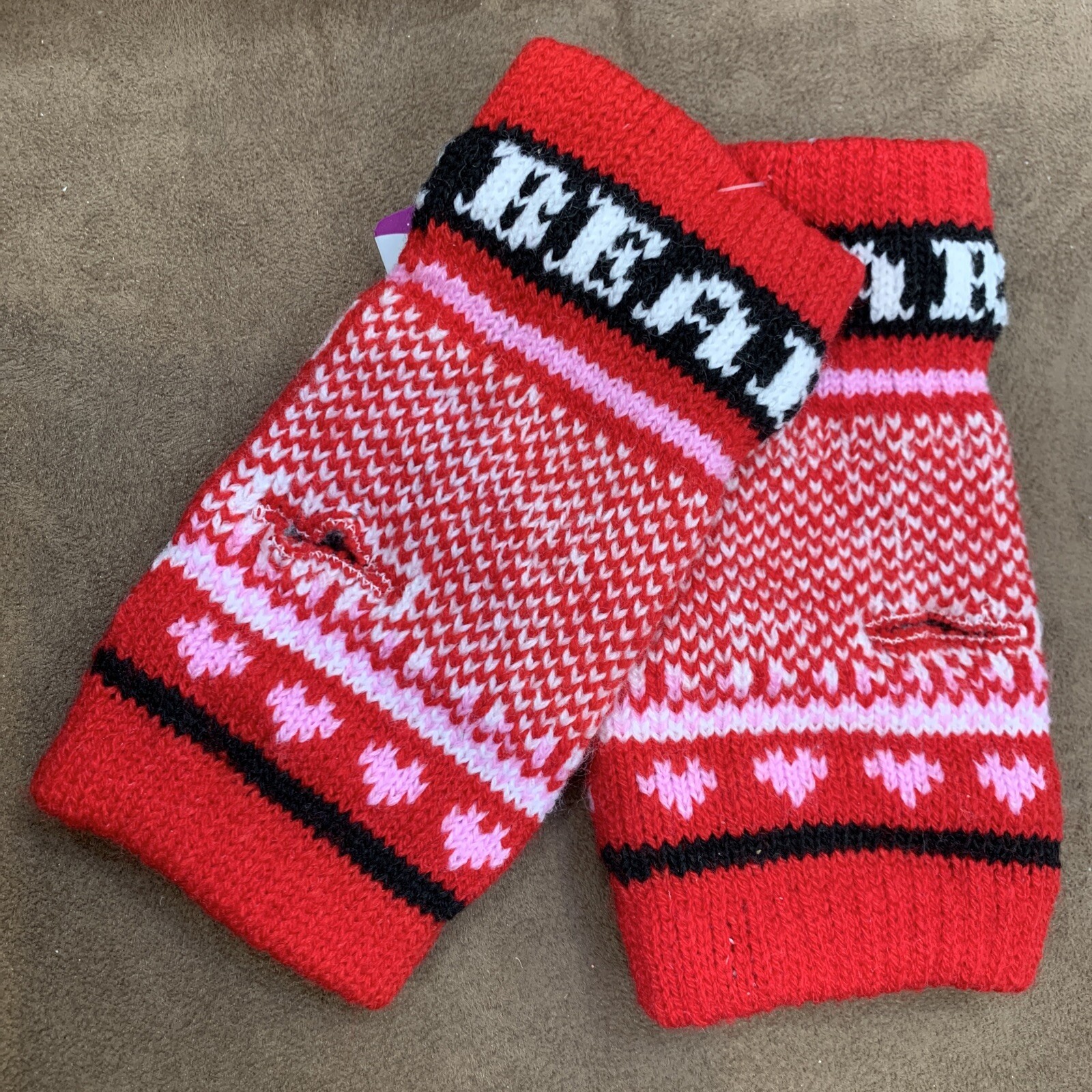 GIRLS GLOVES FINGERLESS RED BEAR HEARTS WARM SUPER CUTE