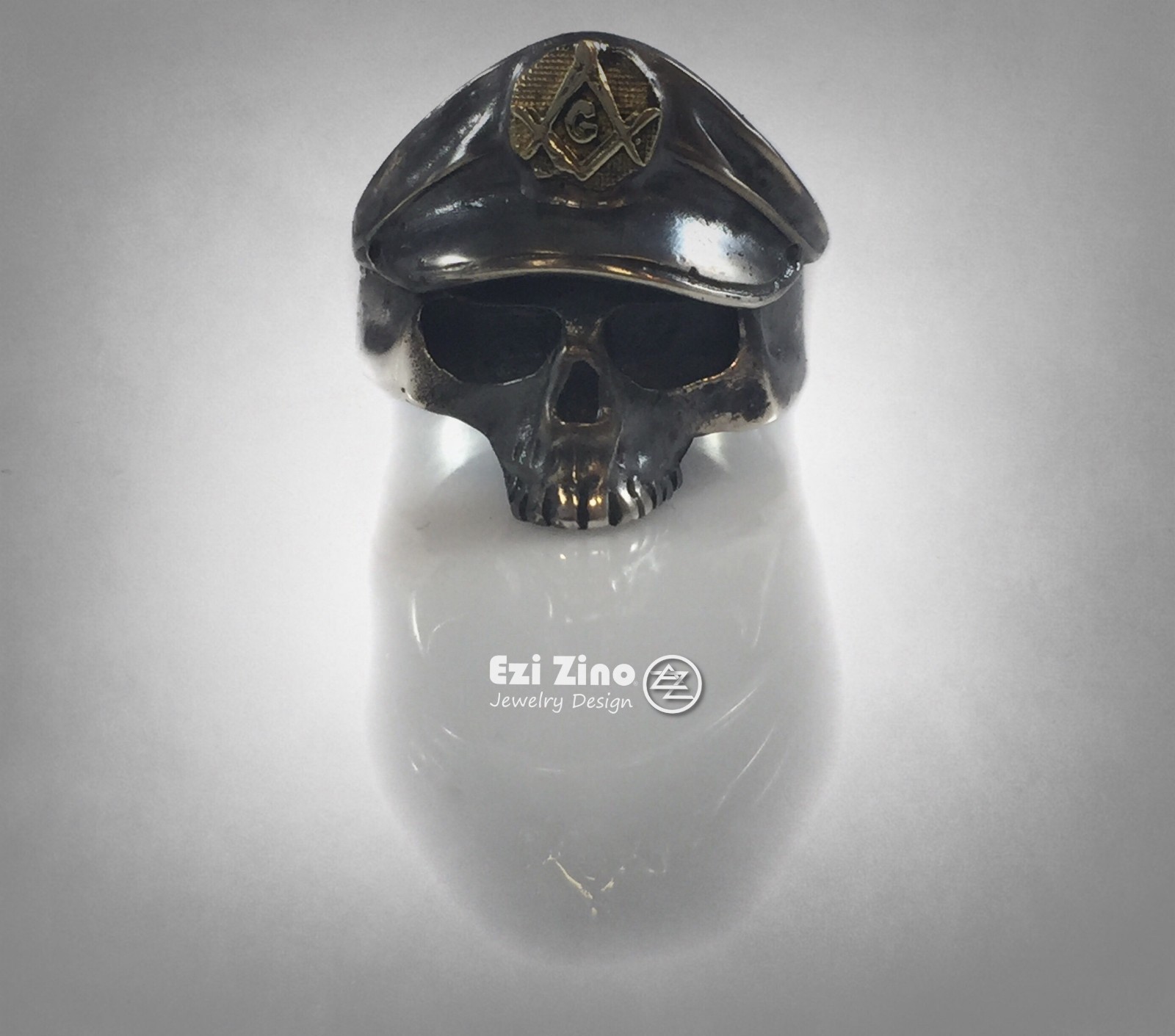 Vintage Masonry Captain Skull Sterling Silver 925 Brass Ring by Ezi Zino