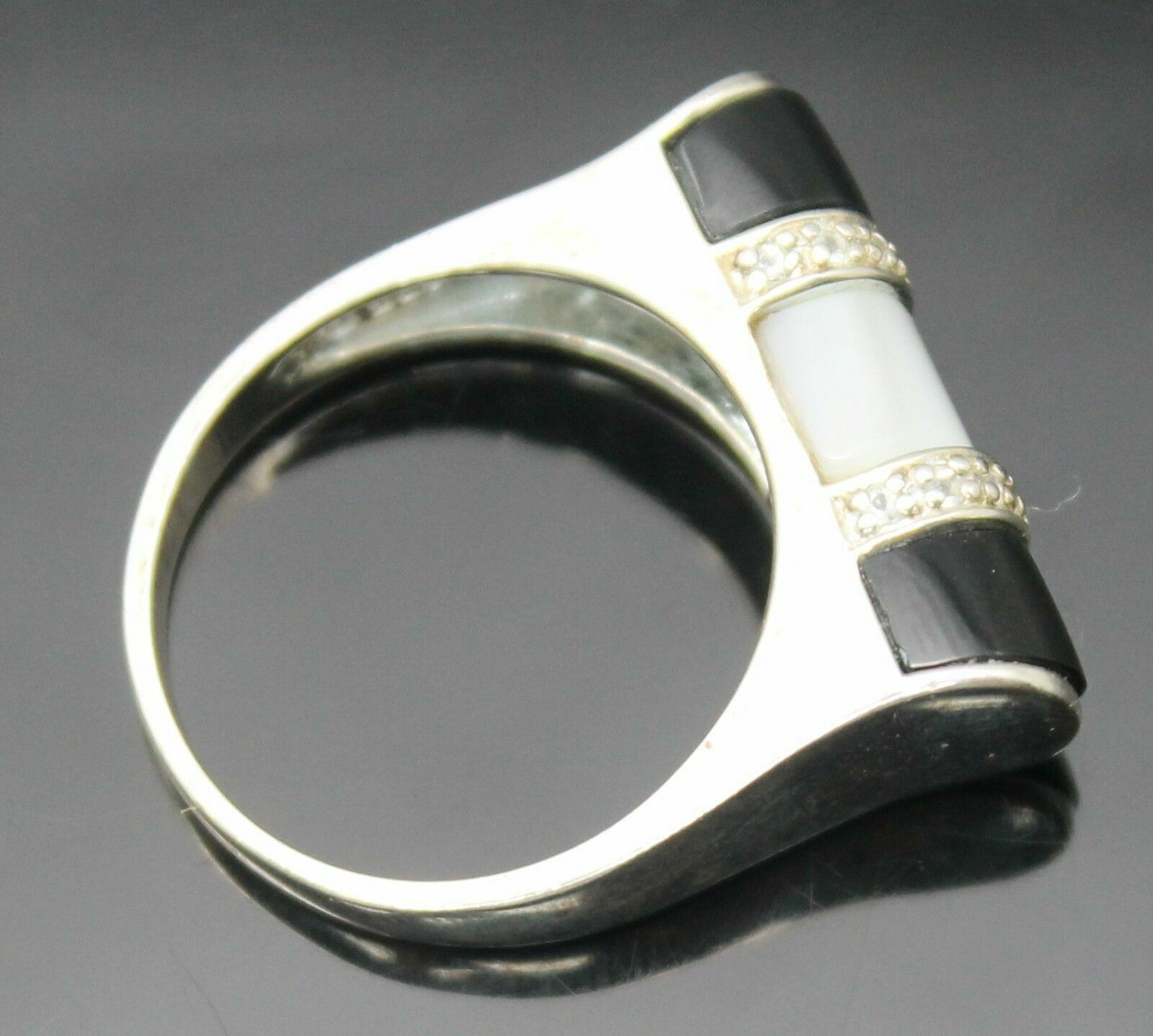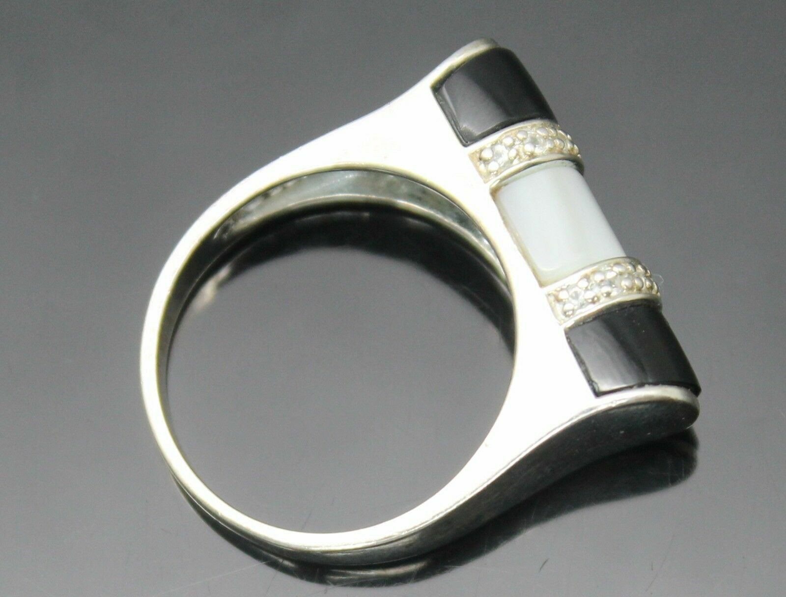 VINTAGE MOTHER OF PEARL BLACK ONYX INLAY WHITE CZ STERLING SILVER RING SZ 9.75