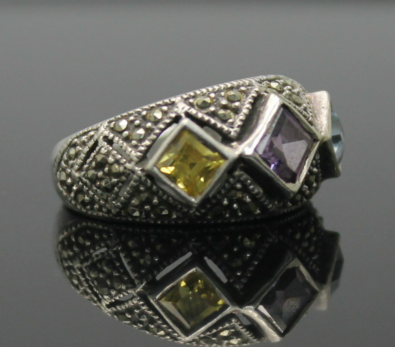 VINTAGE CITRINE AMETHYST BLUE TOPAZ MARCASITES ACCENT STERLING SILVER RING 6.75