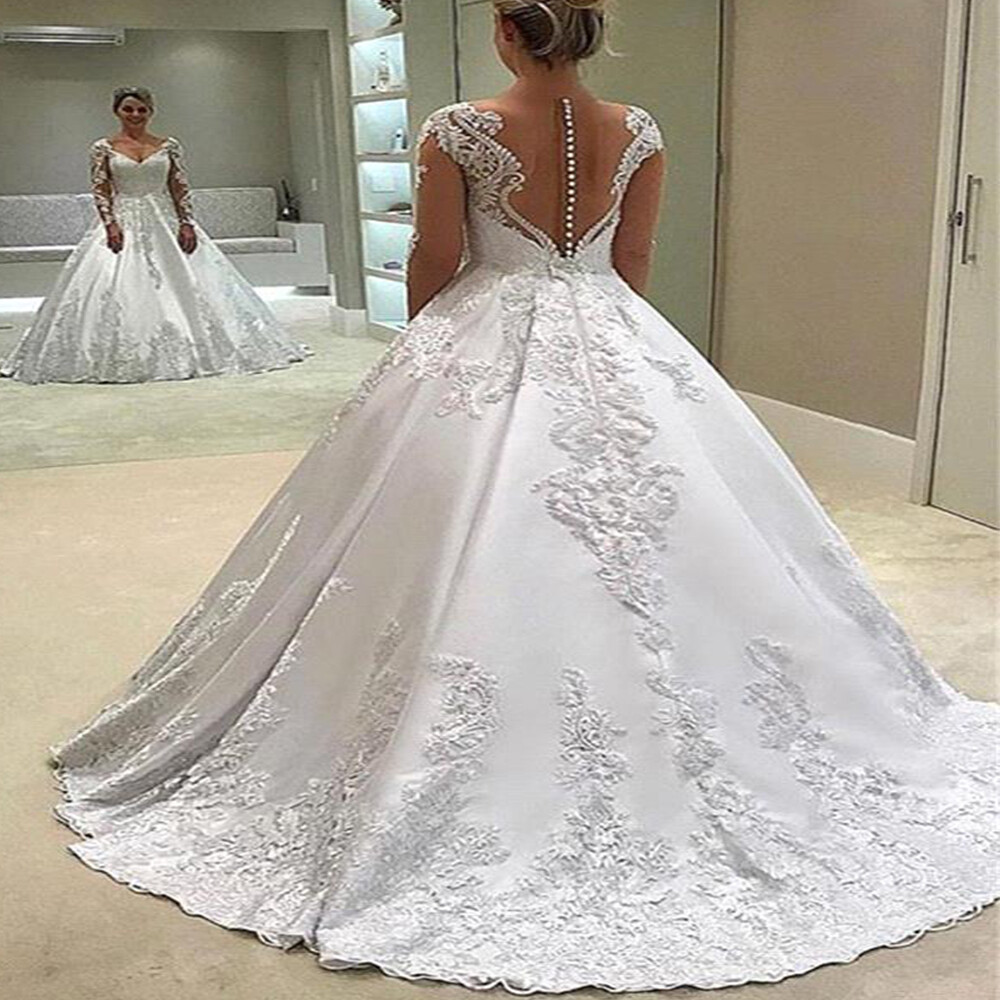 Satin Wedding Dresses White Lace Appliques Long Sleeves Dress V Neck Bridal Gown