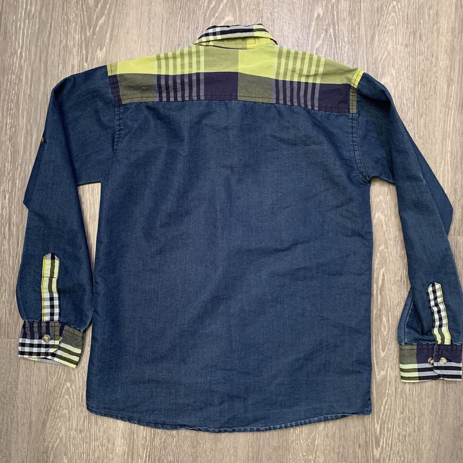 как выглядит Guess Half Jean Half Plaid Button Up Long Sleeve Shirt Youth Boy s Size 14 фото