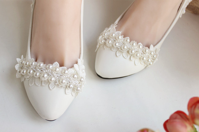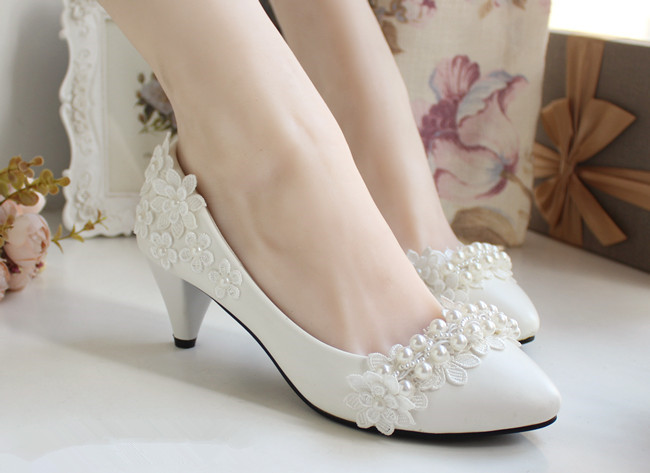 как выглядит Ivory Pearl Flower Wedding Lace Prom Bridal Bridesmaid Flat High Low Heels shoes фото