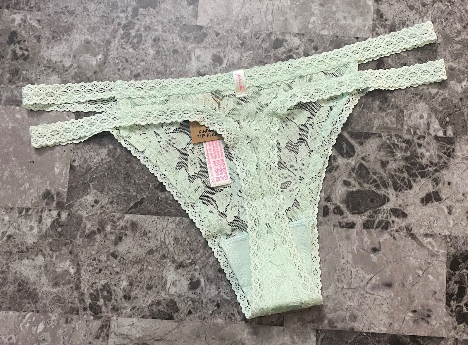 NWT VICTORIA'S SECRET PINK GREEN FLORAL LACE DOUBLE STRAPPY SIDE THONG PANTIES