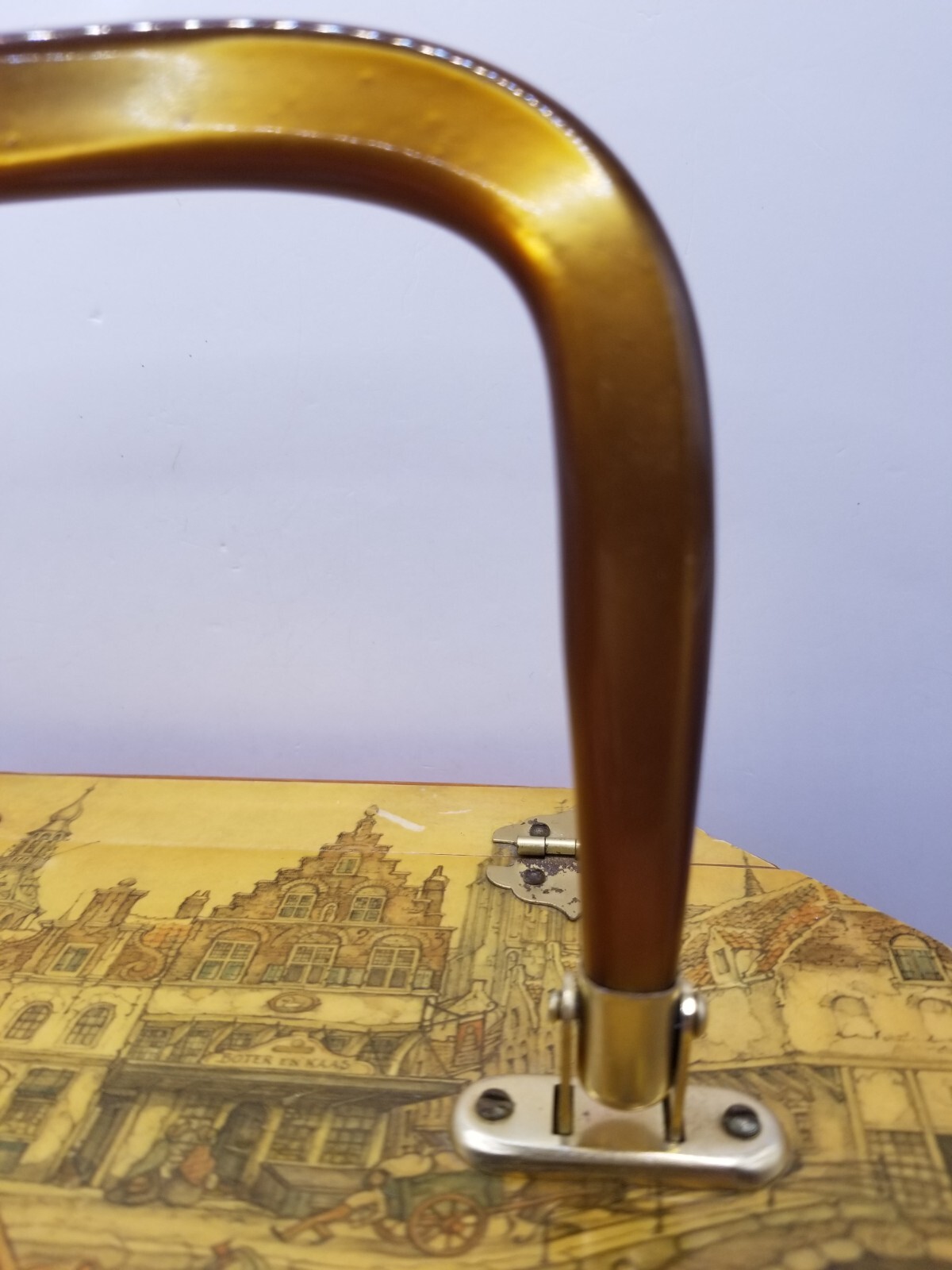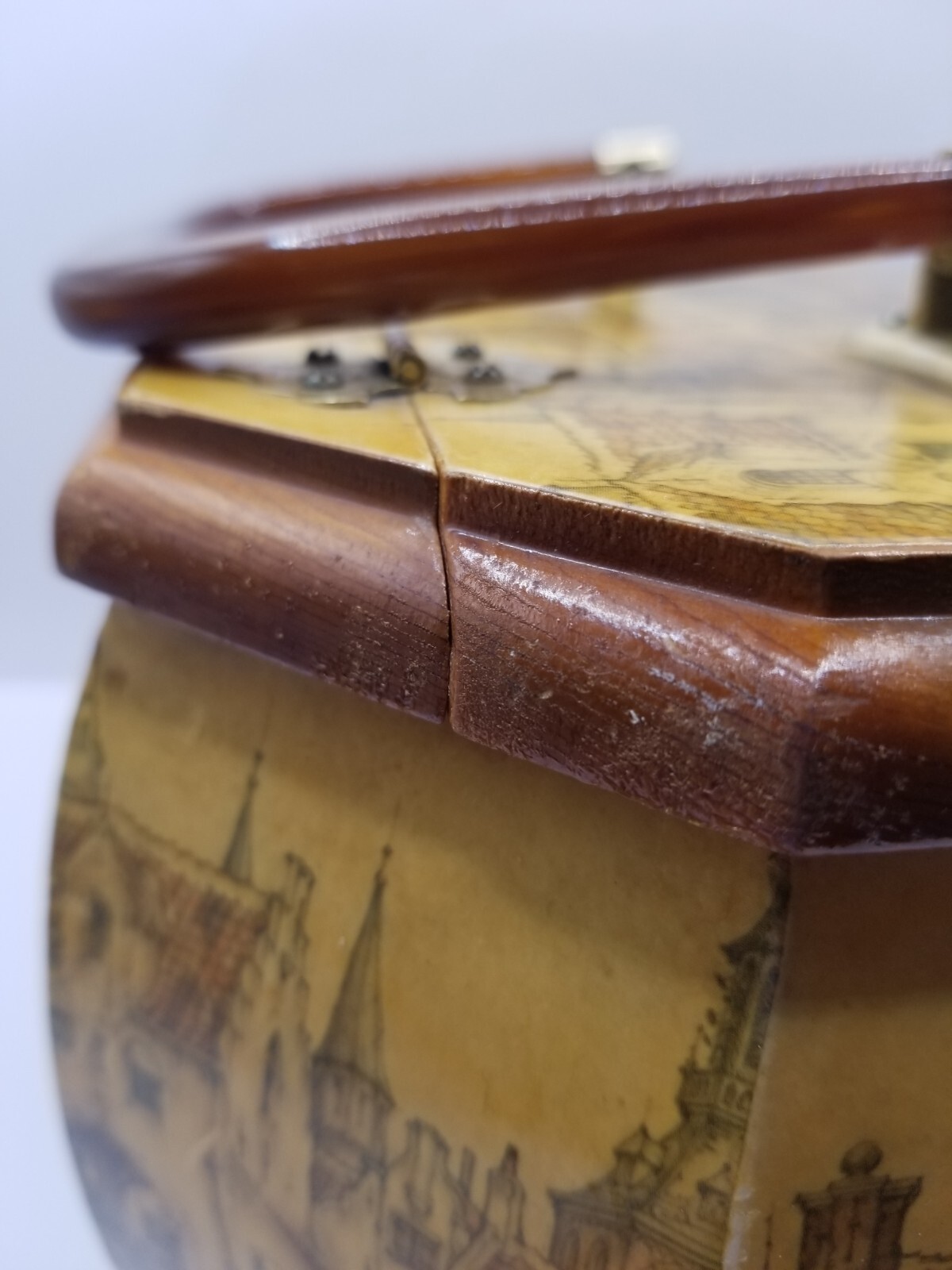 как выглядит Anton Pieck Decoupage Wooden Box Purse Octagonal Lucite Handle Lined Felt Bottom фото