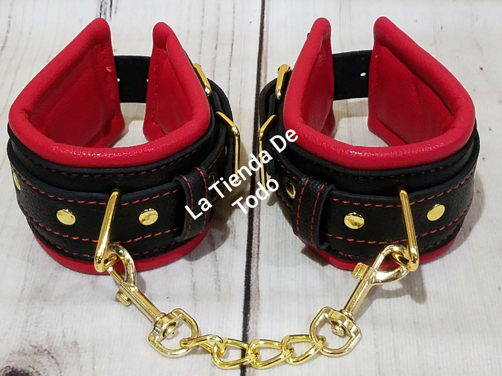 NICE RED AND BLACK CUSHIONED TEXTURED HAND ANKLE CUFFS HANDCUFFS GOLD CHAIN READ