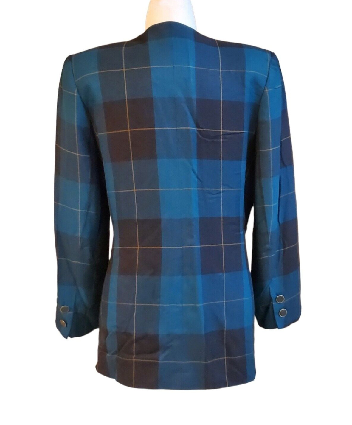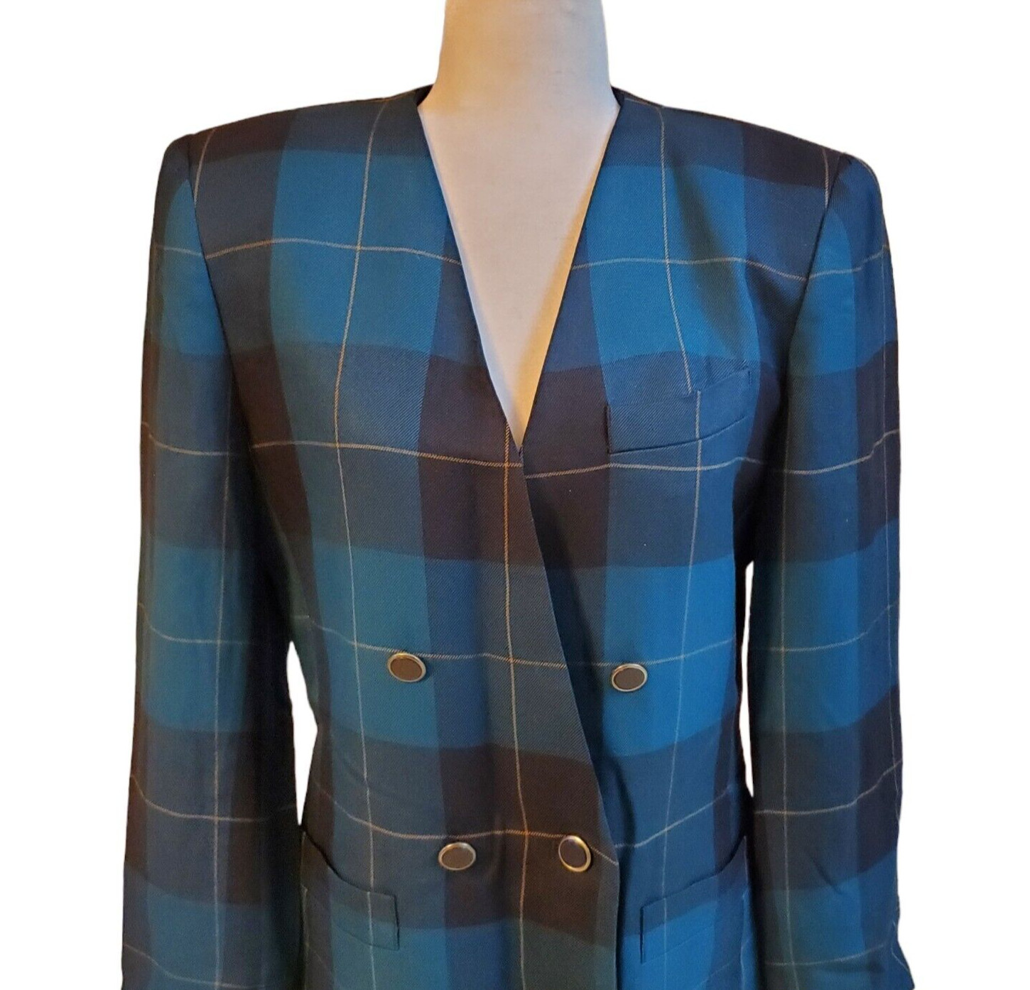 Vintage Kasper ASL Teal blue Plaid Viscose Rayon Doublebreasted Blazer Size 8