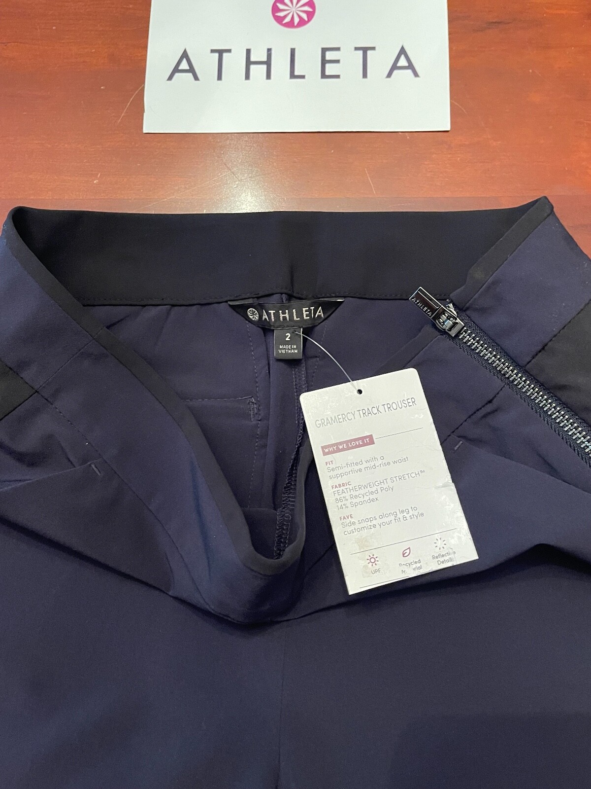 NWT 108.00 ATHLETA featherweight stretch GRAMERCY TRACK navy TROUSER PANTS W 2