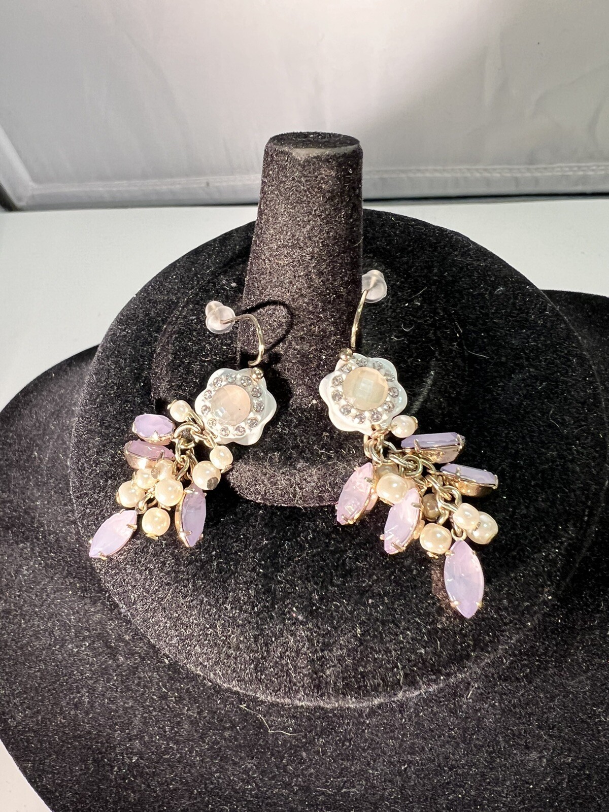 как выглядит BEAUTIFUL PURPLE MARQUISE RHINESTONE FLORAL FLOWER FAUX PEARL DANGLE EARRINGS фото
