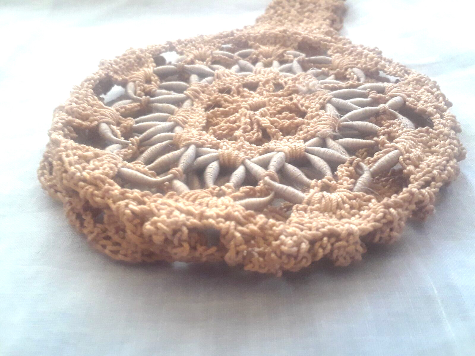 как выглядит Antique Victorian Brides Hand Crocheted Purse Lt Beige Blue Spun Silk Center A фото