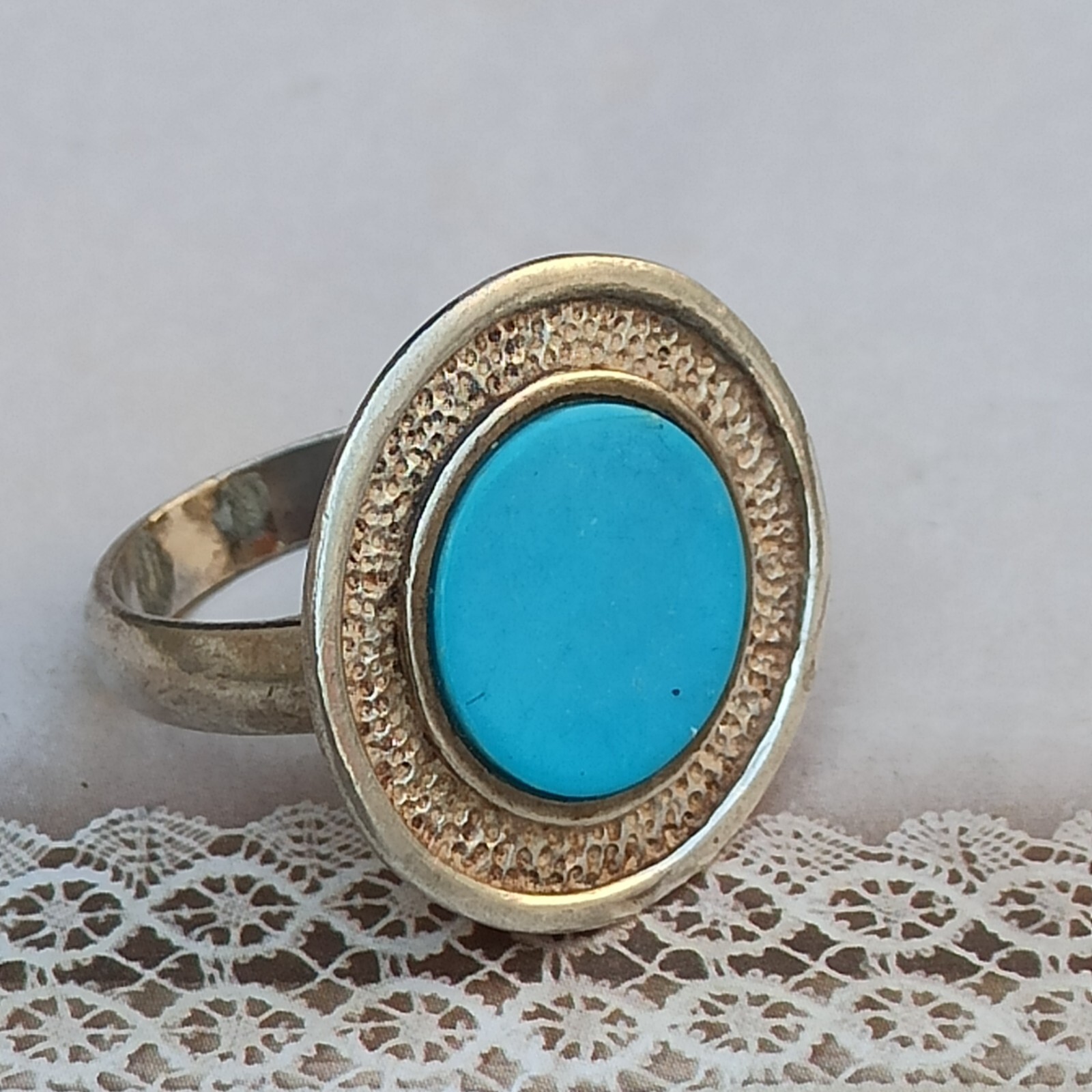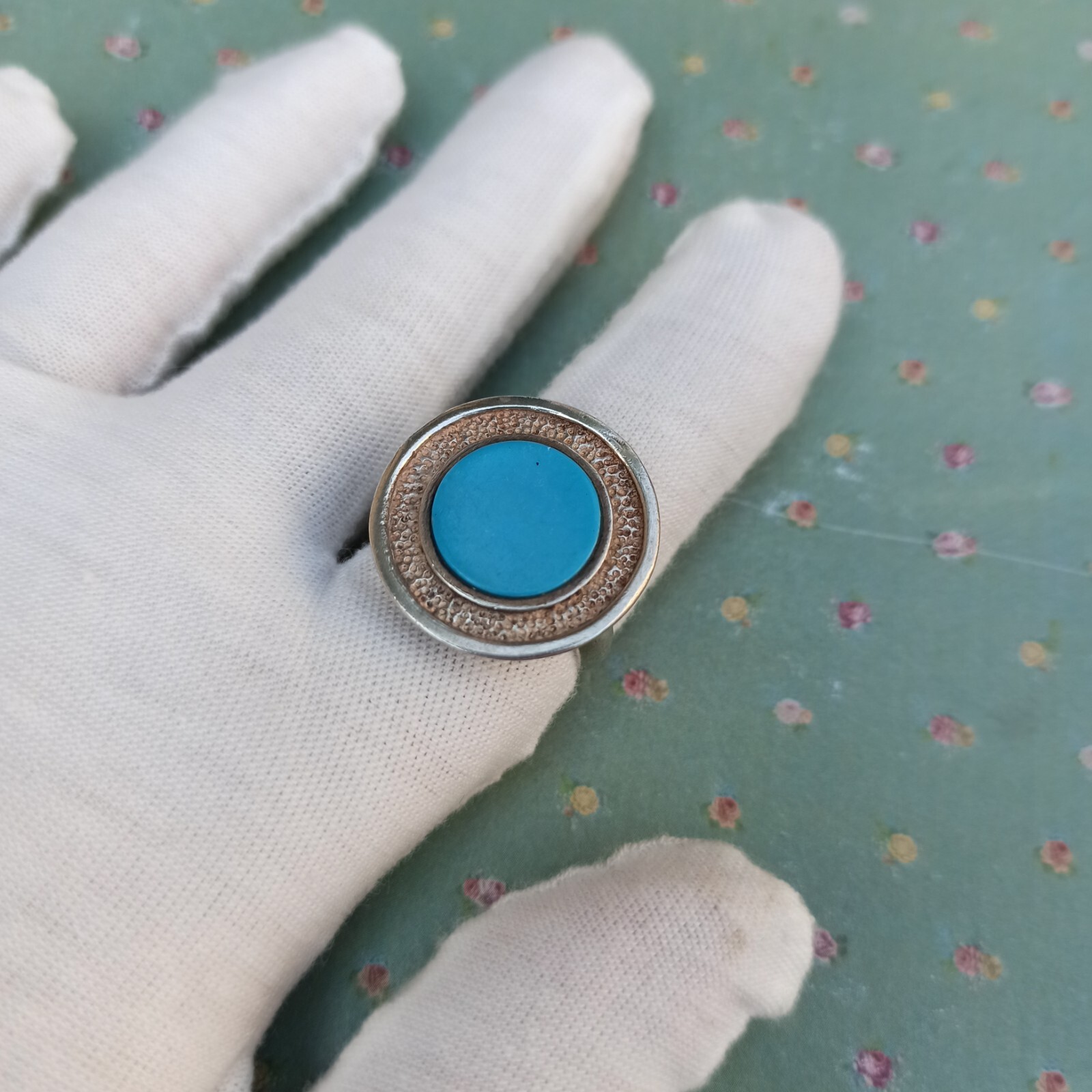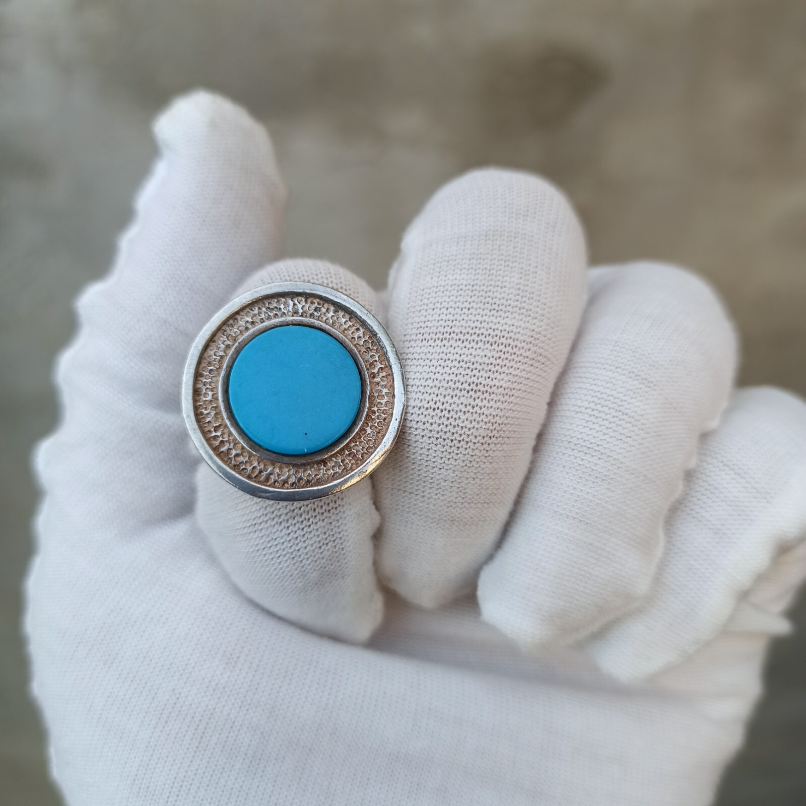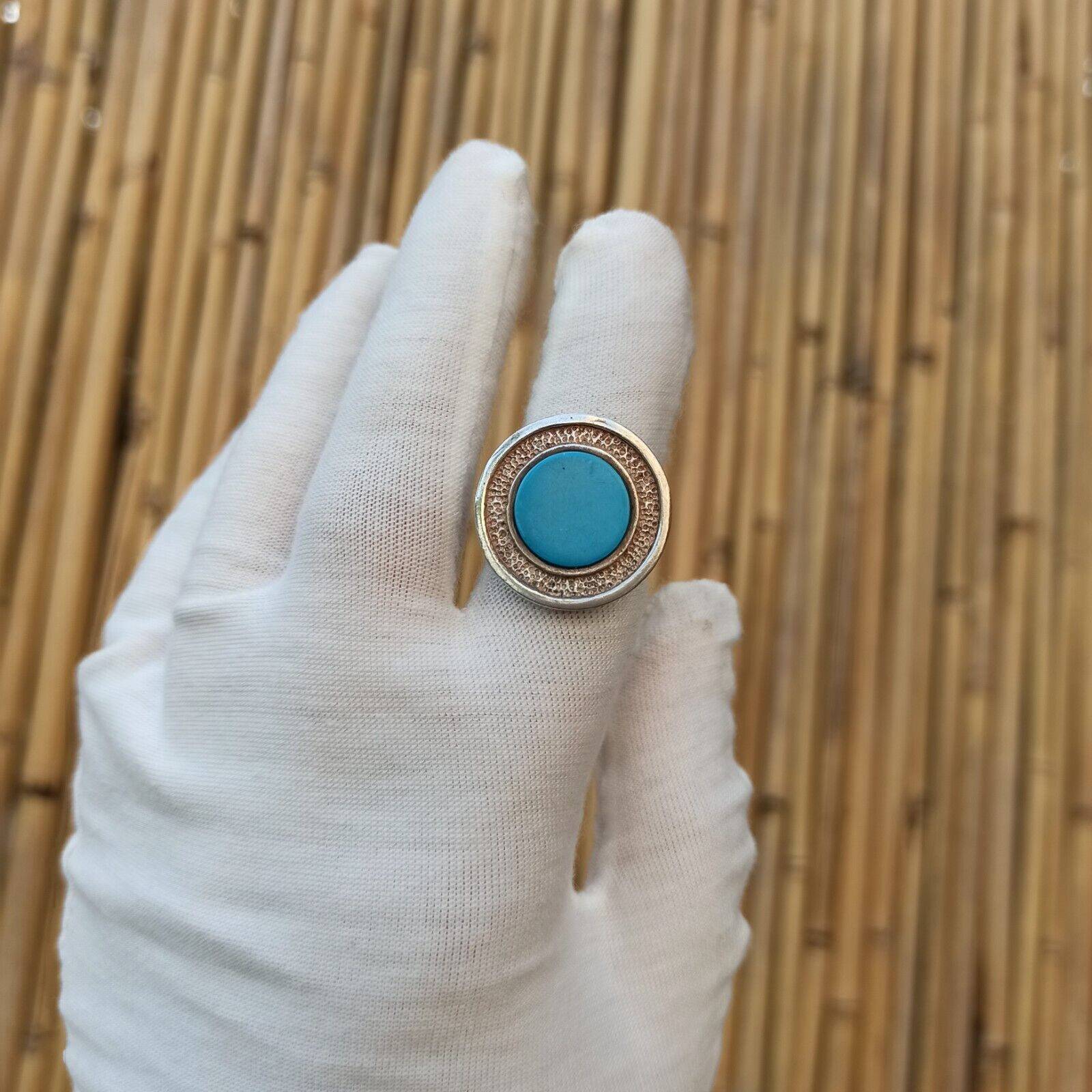как выглядит Vintage Ring Turquoise Israeli Art Solid Silver Round Blue Dimple Modernist Gift фото