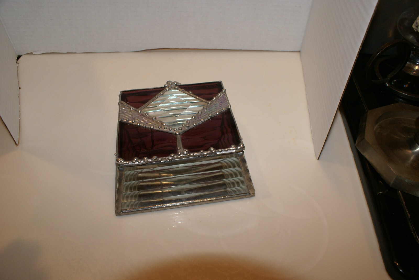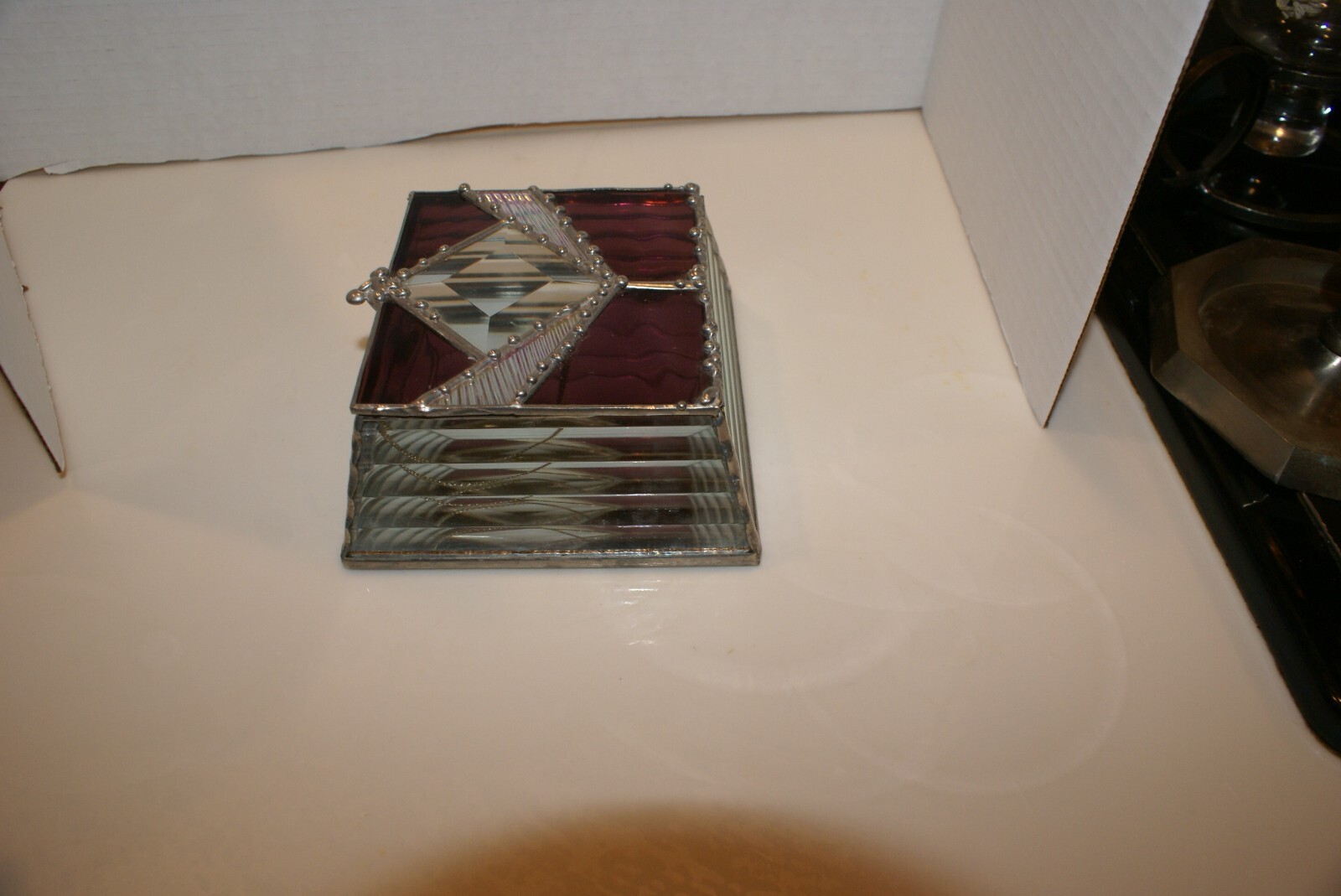 как выглядит Vintage Jewelry Trinket Box Beveled Etched Glass ACRYLIC SIDES PEWTER MIRROR фото