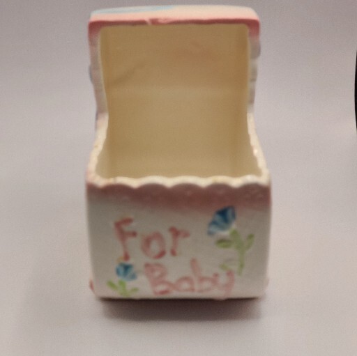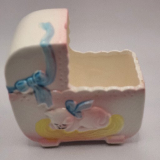 Planter baby ceramic bassinet. Blue ribbon w/ cat on rug. Taiwan. Says For Baby.