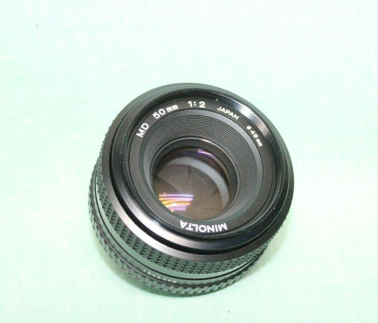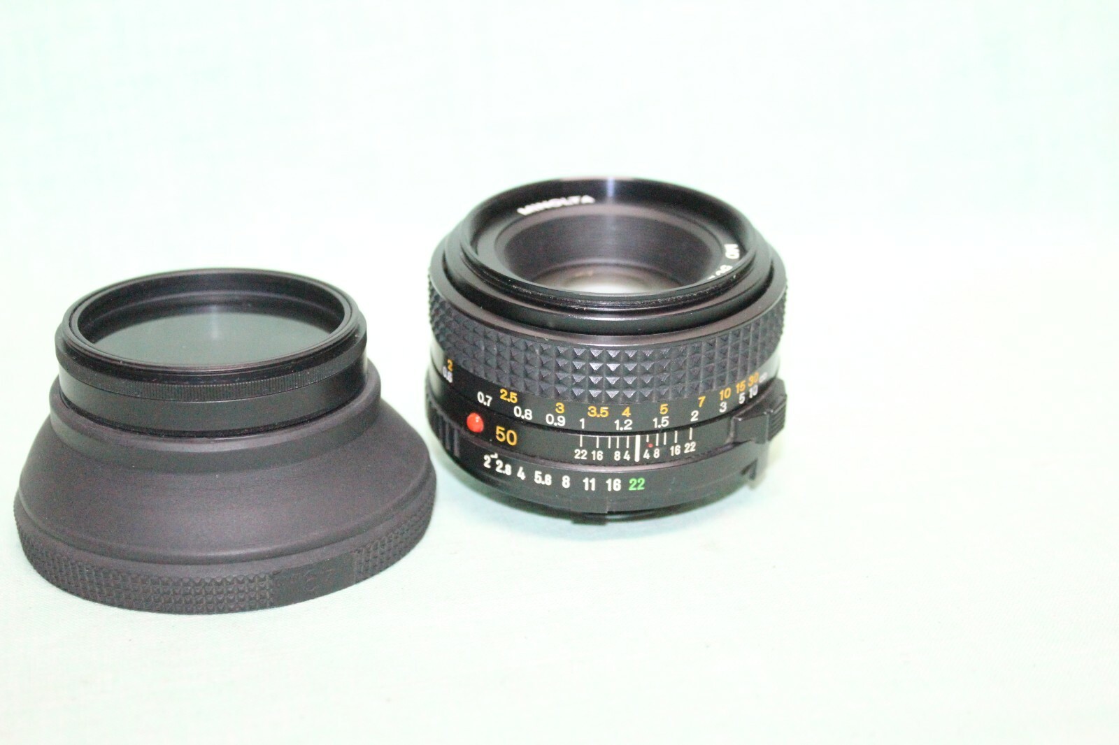 Minolta MD 50mm 1:2 Lens With filter and Lens hood