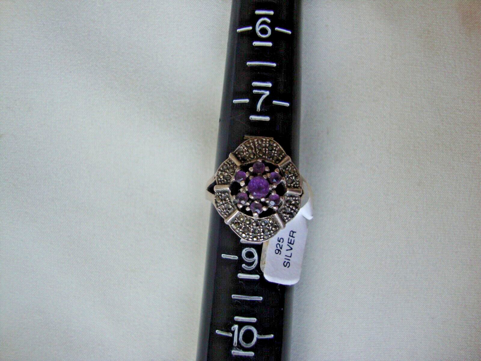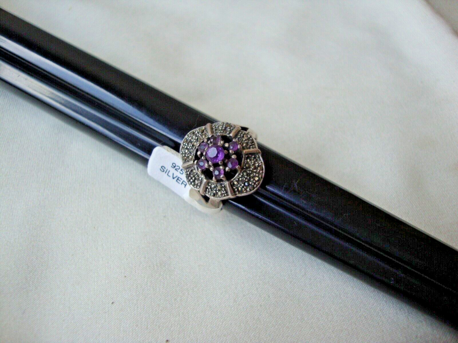 VINTAGE AMETHYST CLUSTER W/ MARCASITE ACCENTS COCKTAIL RING SILVER 925 SZ 8