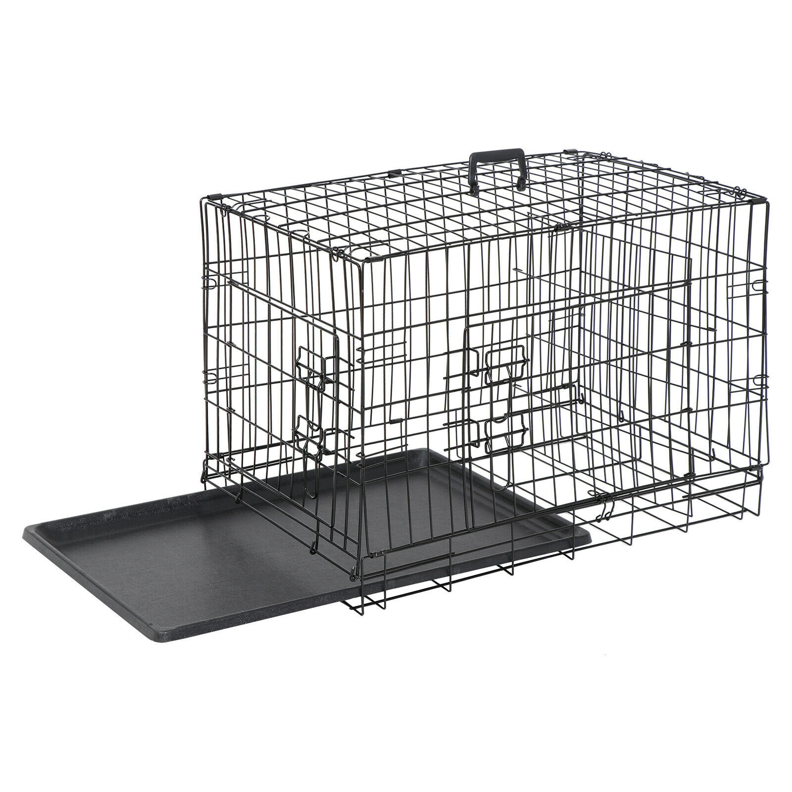 Folding Dog Crate Kennel Metal Pet Cage 2 Door With Tray Pan Black 30 36 42