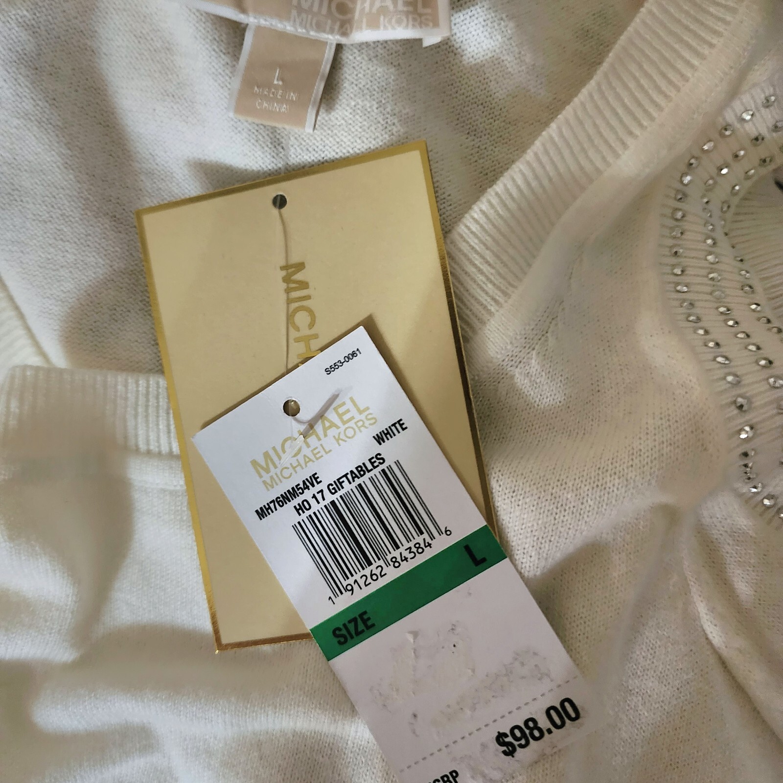 как выглядит NWT Womens MICHAEL KORS White Cold Shoulder Crew Neck Sweater Large MSRP 98.00 фото