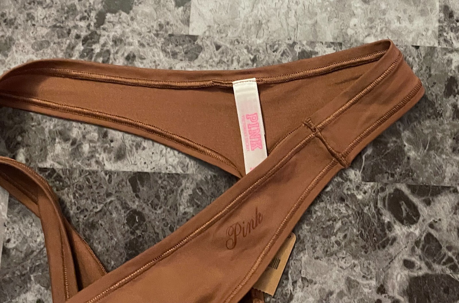 как выглядит NWT VICTORIAS SECRET PINK TAN SMOOTH THIN LOGO BASE STRETCH THONG PANTIES фото